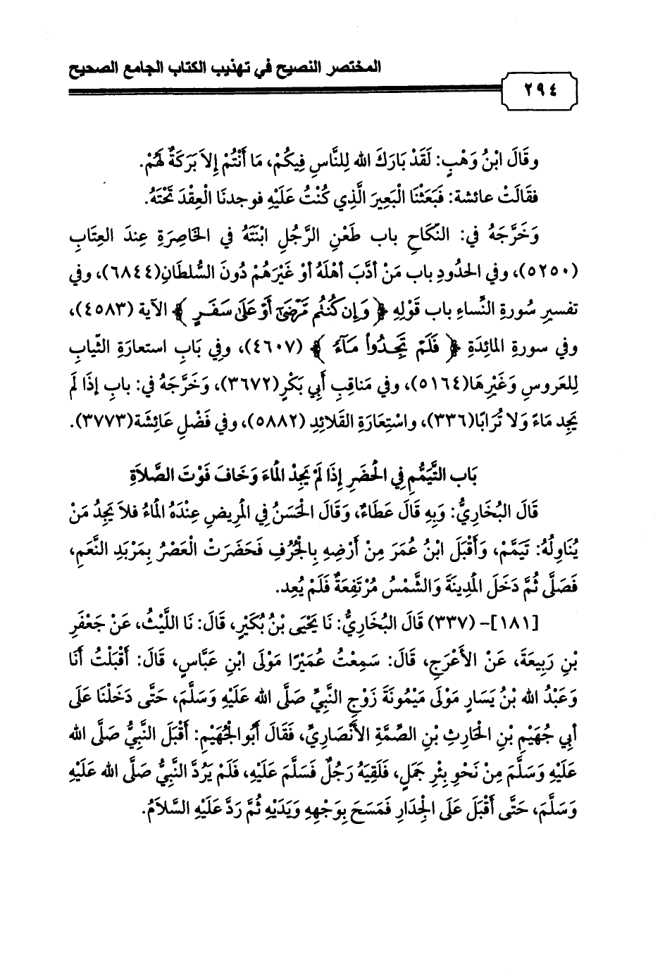 [181]- (337) قَالَ البُخَارِيُّ: نَا يَحْيَى بْنُ بُكَيْرٍ، قَالَ: نَا اللَّيْثُ، عَنْ جَعْفَرِ بْنِ رَبِيعَةَ، عَنْ الأَعْرَجِ، قَالَ: سَمِعْتُ عُمَيْرًا مَوْلَى ابْنِ عَبَّاسٍ، قَالَ: أَقْبَلْتُ أَنَا وَعَبْدُ الله بْنُ يَسَارٍ مَوْلَى مَيْمُونَةَ زَوْجِ النَّبِيِّ صَلَّى الله عَلَيْهِ وَسَلَّمَ، حَتَّى دَخَلْنَا عَلَى أبِي جُهَيْمِ بْنِ الْحَارِثِ بْنِ الصِّمَّةِ الأَنْصَارِيِّ، فَقَالَ أَبُوالْجُهَيْمِ: أَقْبَلَ النَّبِيُّ صَلَّى الله عَلَيْهِ وَسَلَّمَ مِنْ نَحْوِ بِئْرِ جَمَلٍ، فَلَقِيَهُ رَجُلٌ فَسَلَّمَ عَلَيْهِ، فَلَمْ يَرُدَّ النَّبِيُّ صَلَّى الله عَلَيْهِ وَسَلَّمَ، حَتَّى أَقْبَلَ عَلَى الْجِدَارِ فَمَسَحَ بِوَجْهِهِ وَيَدَيْهِ ثُمَّ رَدَّ عَلَيْهِ السَّلاَمُ.