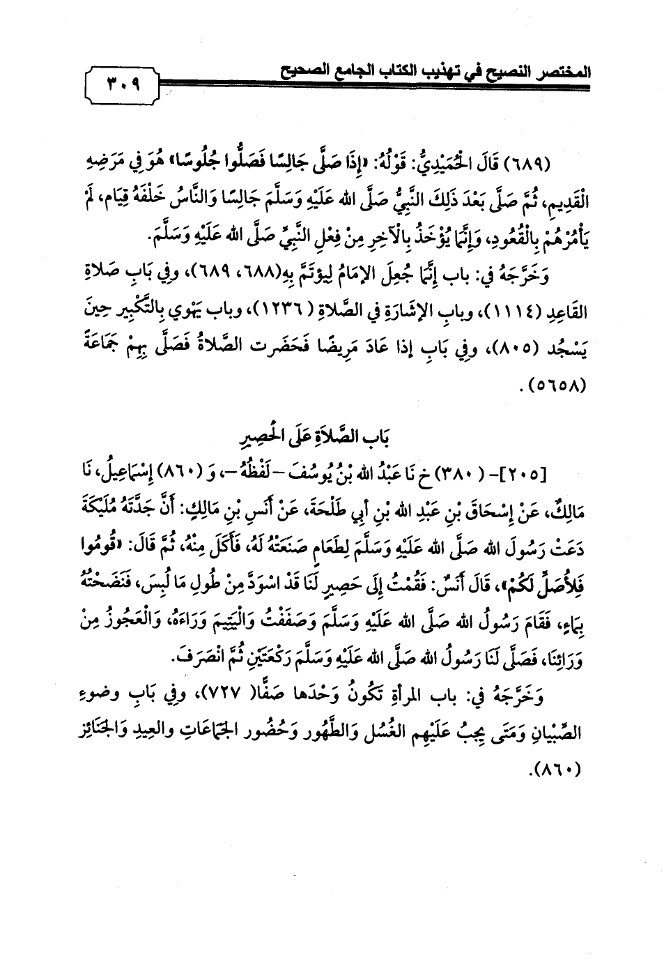 [205]- (380) خ نَا عَبْدُ الله بْنُ يُوسُفَ - لَفْظُهُ -، وَ (860) إِسْمَاعِيلُ، نَا مَالِكٌ، عَنْ إِسْحَاقَ بْنِ عَبْدِ الله بْنِ أبِي طَلْحَةَ، عَنْ أَنَسِ بْنِ مَالِكٍ: أَنَّ جَدَّتَهُ مُلَيْكَةَ دَعَتْ رَسُولَ الله صَلَّى الله عَلَيْهِ وَسَلَّمَ لِطَعَامٍ صَنَعَتْهُ لَهُ، فَأَكَلَ مِنْهُ، ثُمَّ قَالَ: «قُومُوا فَلِأُصَلِّ لَكُمْ»، قَالَ أَنَسٌ: فَقُمْتُ إِلَى حَصِيرٍ لَنَا قَدْ اسْوَدَّ مِنْ طُولِ مَا لُبِسَ، فَنَضَحْتُهُ بِمَاءٍ، فَقَامَ رَسُولُ الله صَلَّى الله عَلَيْهِ وَسَلَّمَ وَصَفَفْتُ وَالْيَتِيمَ وَرَاءَهُ، وَالْعَجُوزُ مِنْ وَرَائِنَا، فَصَلَّى لَنَا رَسُولُ الله صَلَّى الله عَلَيْهِ وَسَلَّمَ رَكْعَتَيْنِ ثُمَّ انْصَرَفَ.
