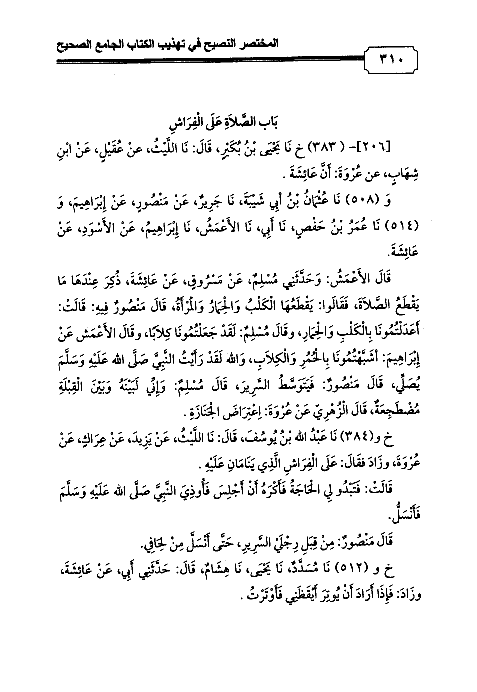 وَ (508) نَا عُثْمَانُ بْنُ أبِي شَيْبَةَ، نَا جَرِيرٌ، عَنْ مَنْصُورٍ، عَنْ إِبْرَاهِيمَ, وَ (514) نَا عُمَرُ بْنُ حَفْصٍ، نَا أَبِي، نَا الأَعْمَشُ، نَا إِبْرَاهِيمُ، عَنْ الأَسْوَدِ، عَنْ عَائِشَةَ.