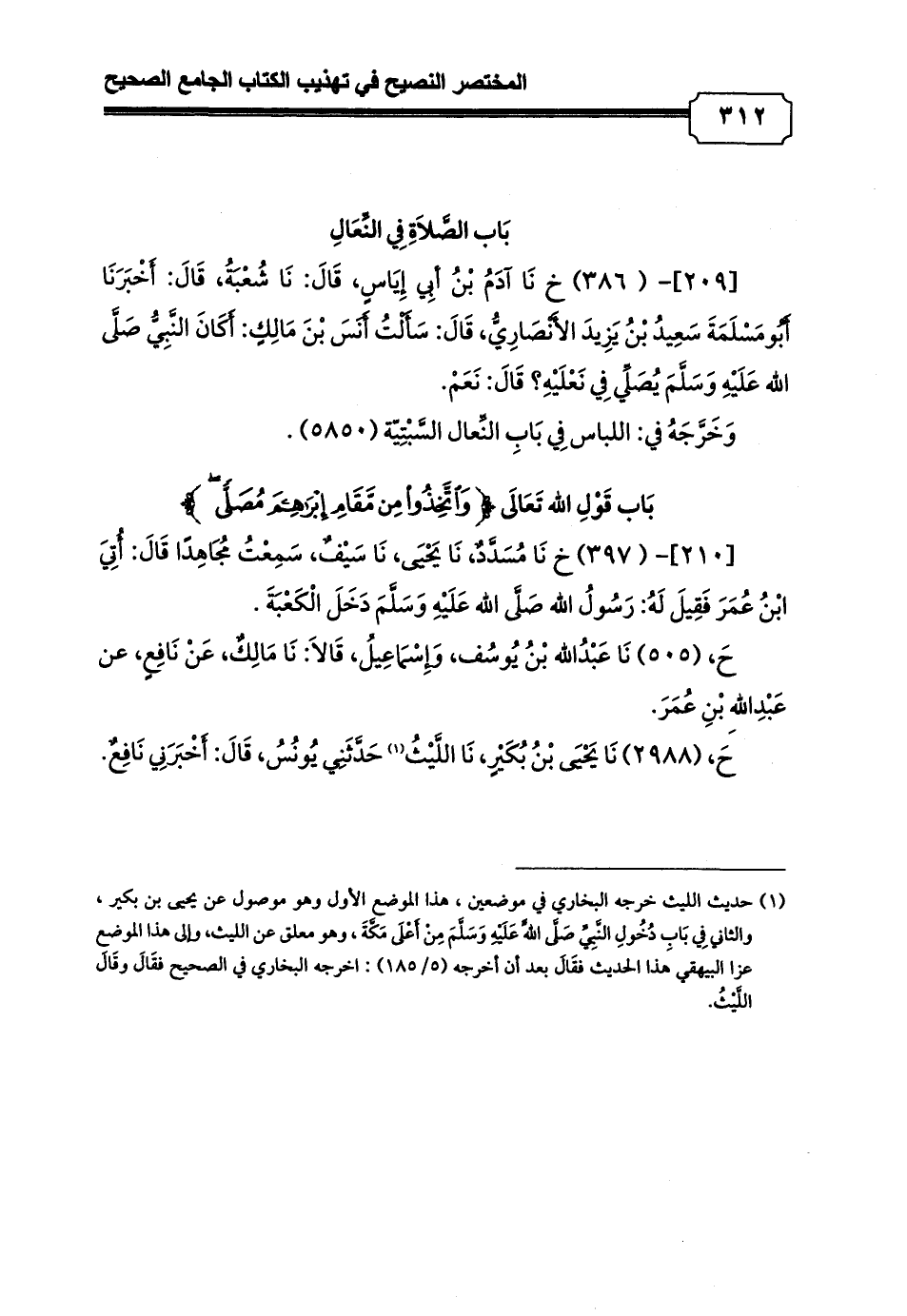 [209]- (386) خ نَا آدَمُ بْنُ أبِي إِيَاسٍ، قَالَ: نَا شُعْبَةُ، قَالَ: أَخْبَرَنَا أَبُومَسْلَمَةَ سَعِيدُ بْنُ يَزِيدَ الأَنْصَارِيُّ، قَالَ: سَأَلْتُ أَنَسَ بْنَ مَالِكٍ: أَكَانَ النَّبِيُّ صَلَّى الله عَلَيْهِ وَسَلَّمَ يُصَلِّي فِي نَعْلَيْهِ؟ قَالَ: نَعَمْ.