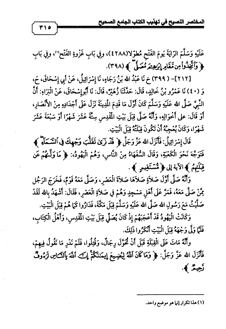 [212]- (399) خ نَا عَبْدُ الله بْنُ رَجَاءٍ، نَا إِسْرَائِيلُ، عَنْ أبِي إِسْحَاقَ، حَ، وَ (40) نَا عَمْرُو بْنُ خَالِدٍ، قَالَ: حَدَّثَنَا زُهَيْرٌ، قَالَ: نَا أَبُوإِسْحَاقَ، عَنْ الْبَرَاءِ: أَنَّ النَّبِيَّ صَلَّى الله عَلَيْهِ وَسَلَّمَ كَانَ أَوَّلَ مَا قَدِمَ الْمَدِينَةَ نَزَلَ عَلَى أَجْدَادِهِ مِنْ الأَنْصَارِ، أَوْ قَالَ: على أَخْوَالِهِ، وَأَنَّهُ صَلَّى قِبَلَ بَيْتِ الْمَقْدِسِ سِتَّةَ عَشَرَ شَهْرًا أَوْ سَبْعَةَ عَشَرَ شَهْرًا، وَكَانَ يُعْجِبُهُ أَنْ تَكُونَ قِبْلَتُهُ قِبَلَ الْبَيْتِ.