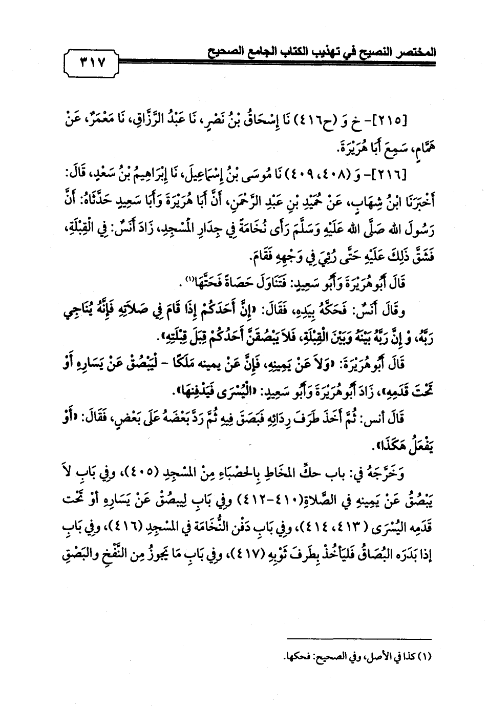 وَخَرَّجَهُ في: باب حكِّ المخَاطِ بِالحصْبَاءِ مِنْ المسْجِدِ (405)، وفِي بَابِ لاَ يَبْصُقُ عَنْ يَمِينهِ في الصَّلاةِ (410 - 412) وفِي بَابِ لِيبصُقْ عَنْ يَسَارِهِ أوْ تَحْت قَدَمِه اليُسْرَى (413, 414)، وفِي بَابِ دَفْن النُّخَامَة في المسْجِدِ (416) , وفِي بَابِ إذا بَدَرَه البُصَاقُ فَليَأخُذْ بِطَرفَ ثَوْبِهِ (417)، وفِي بَابِ مَا يَجوزُ مِن النَّفْخِ والبَصْقِ