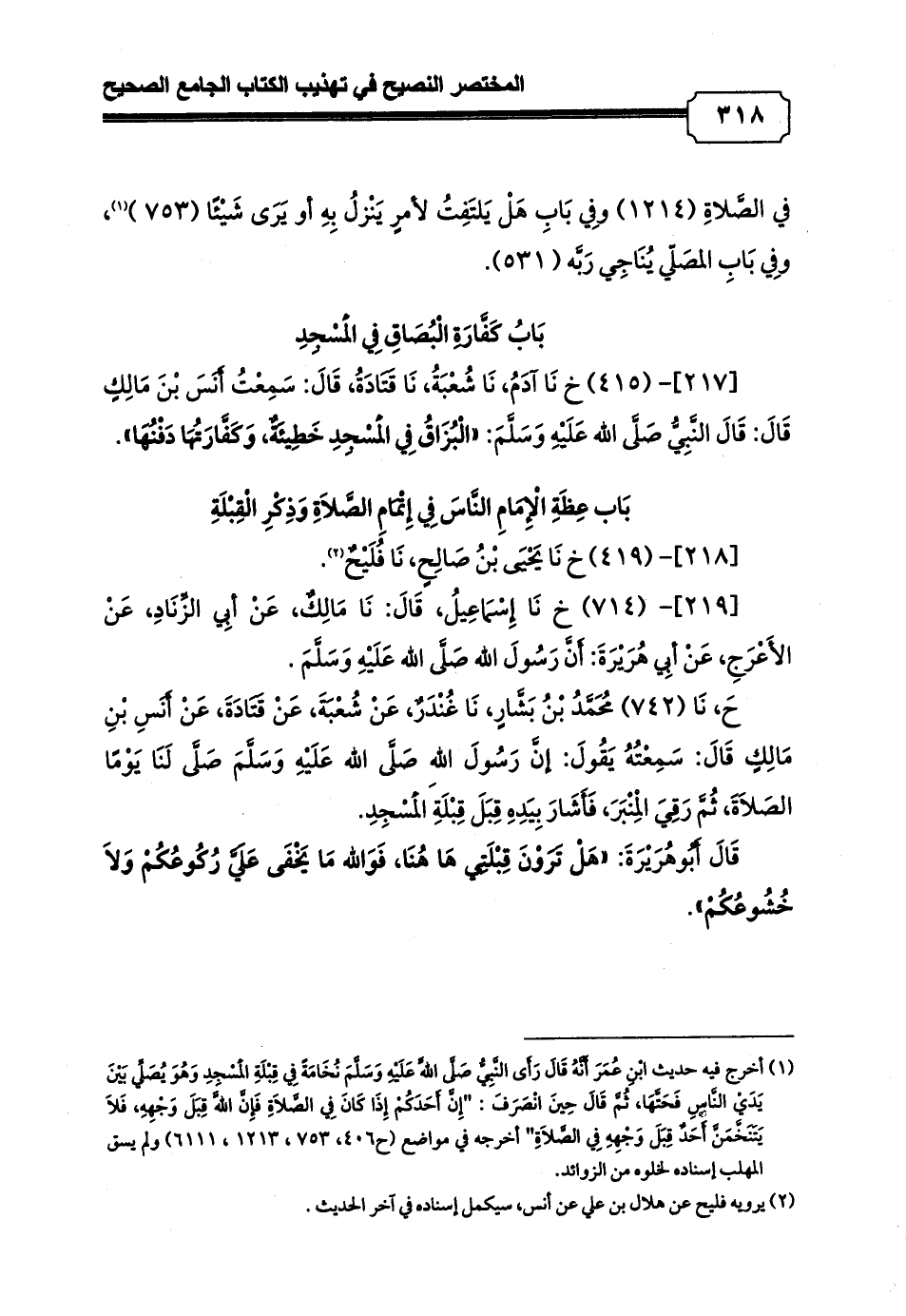 [217]- (415) خ نَا آدَمُ، نَا شُعْبَةُ، نَا قَتَادَةُ، قَالَ: سَمِعْتُ أَنَسَ بْنَ مَالِكٍ قَالَ: قَالَ النَّبِيُّ صَلَّى الله عَلَيْهِ وَسَلَّمَ: «الْبُزَاقُ فِي الْمَسْجِدِ خَطِيئَةٌ، وَكَفَّارَتُهَا دَفْنُهَا».
