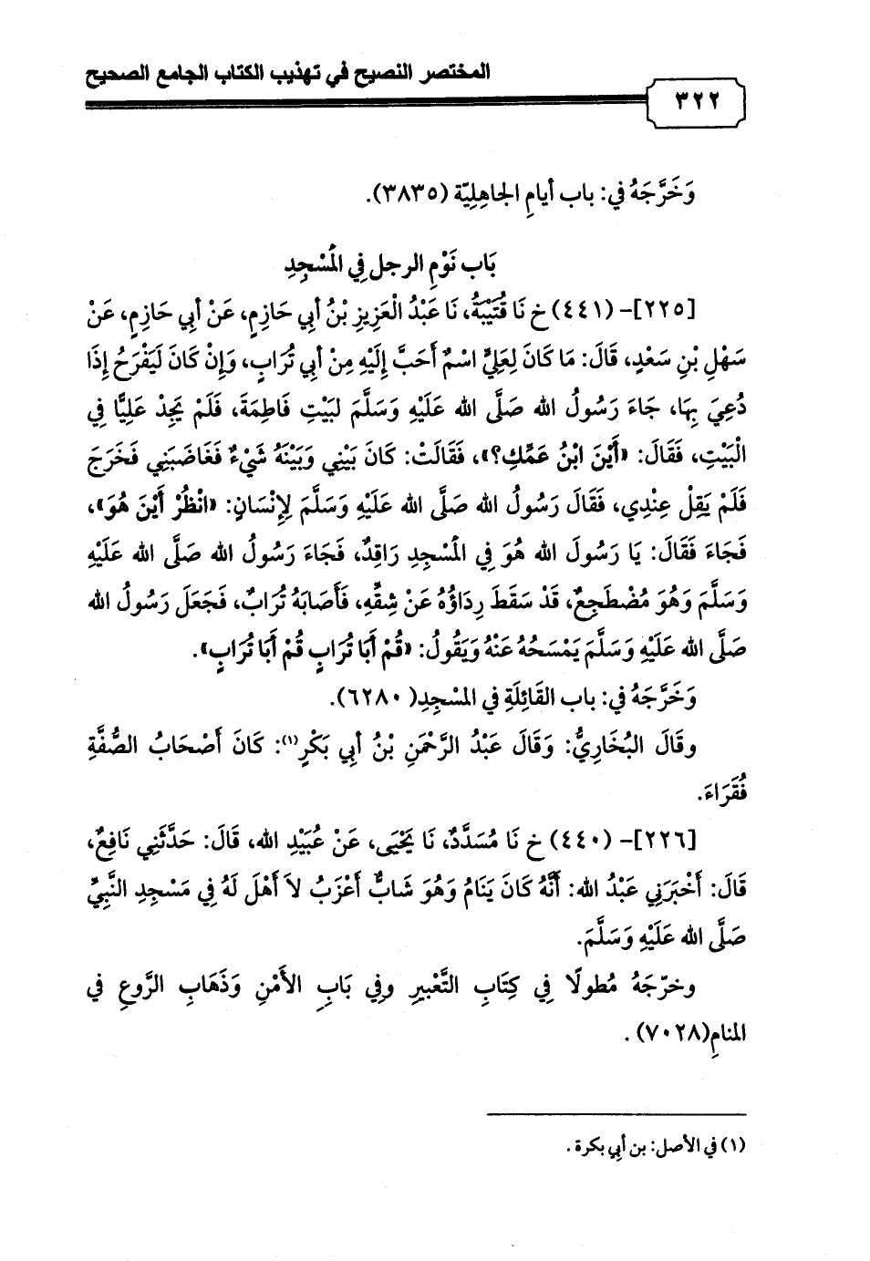 [225]- (441) خ نَا قُتَيْبَةُ، نَا عَبْدُ الْعَزِيزِ بْنُ أبِي حَازِمٍ، عَنْ أبِي حَازِمٍ، عَنْ سَهْلِ بْنِ سَعْدٍ، قَالَ: مَا كَانَ لِعَلِيٍّ اسْمٌ أَحَبَّ إِلَيْهِ مِنْ أبِي تُرَابٍ، وَإِنْ كَانَ لَيَفْرَحُ إِذَا دُعِيَ بِهَا، جَاءَ رَسُولُ الله صَلَّى الله عَلَيْهِ وَسَلَّمَ لبَيْتِ فَاطِمَةَ، فَلَمْ يَجِدْ عَلِيًّا فِي الْبَيْتِ، فَقَالَ: «أَيْنَ ابْنُ عَمِّكِ؟»، فَقَالَتْ: كَانَ بَيْنِي وَبَيْنَهُ شَيْءٌ فَغَاضَبَنِي فَخَرَجَ فَلَمْ يَقِلْ عِنْدِي، فَقَالَ رَسُولُ الله صَلَّى الله عَلَيْهِ وَسَلَّمَ لِإِنْسَانٍ: «انْظُرْ أَيْنَ هُوَ»، فَجَاءَ فَقَالَ: يَا رَسُولَ الله هُوَ فِي الْمَسْجِدِ رَاقِدٌ، فَجَاءَ رَسُولُ الله صَلَّى الله عَلَيْهِ وَسَلَّمَ وَهُوَ مُضْطَجِعٌ، قَدْ سَقَطَ رِدَاؤُهُ عَنْ شِقِّهِ، فَأَصَابَهُ تُرَابٌ، فَجَعَلَ رَسُولُ الله صَلَّى الله عَلَيْهِ وَسَلَّمَ يَمْسَحُهُ عَنْهُ وَيَقُولُ: «قُمْ أَبَا تُرَابٍ قُمْ أَبَا تُرَابٍ».