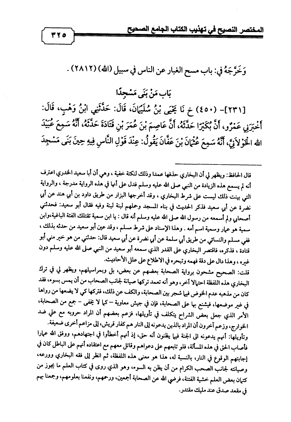 [231]- (450) خ نَا يَحْيَى بْنُ سُلَيْمَانَ، قَالَ: حَدَّثَنِي ابْنُ وَهْبٍ، قَالَ: أَخْبَرَنِي عَمْرٌو، أَنَّ بُكَيْرًا حَدَّثَهُ، أَنَّ عَاصِمَ بْنَ عُمَرَ بْنِ قَتَادَةَ حَدَّثَهُ، أَنَّهُ سَمِعَ عُبَيْدَ الله الْخَوْلاَنِيَّ، أَنَّهُ سَمِعَ عُثْمَانَ بْنَ عَفَّانَ يَقُولُ: عِنْدَ قَوْلِ النَّاسِ فِيهِ حِينَ بَنَى مَسْجِدَ