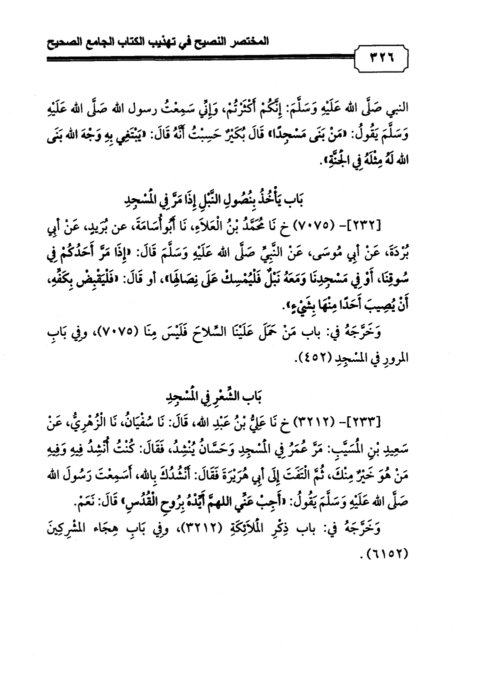 [232]- (7075) خ نَا مُحَمَّدُ بْنُ الْعَلاَءِ، نَا أَبُوأُسَامَةَ، عن بُرَيدٍ، عَنْ أبِي بُرْدَةَ، عَنْ أبِي مُوسَى، عَنْ النَّبِيِّ صَلَّى الله عَلَيْهِ وَسَلَّمَ قَالَ: «إِذَا مَرَّ أَحَدُكُمْ فِي سُوقِنَا، أَوْ فِي مَسْجِدِنَا وَمَعَهُ نَبْلٌ فَلْيُمْسِكْ عَلَى نِصَالِهَا» , أو قَالَ: «فَلْيَقْبِضْ بِكَفِّهِ، أَنْ يُصِيبَ أَحَدًا مِنْهَا بِشَيْءٍ».