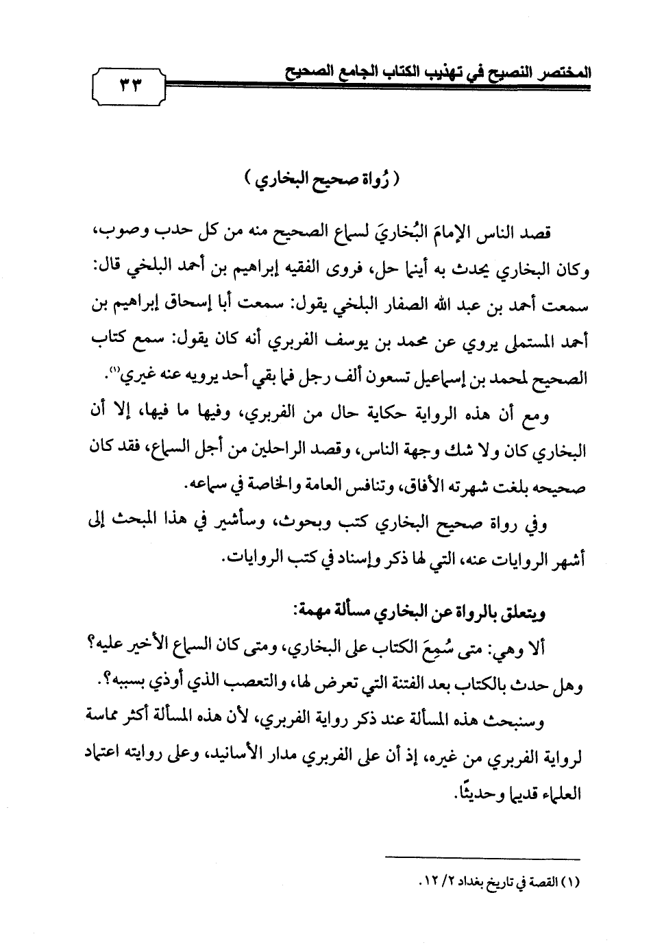 وسنبحث هذه المسألة عند ذكر رواية الفربري، لأن هذه المسألة أكثر مماسة لرواية الفربري من غيره، إذ أن على الفربري مدار الأسانيد، وعلى روايته اعتماد العلماء قديما وحديثًا.