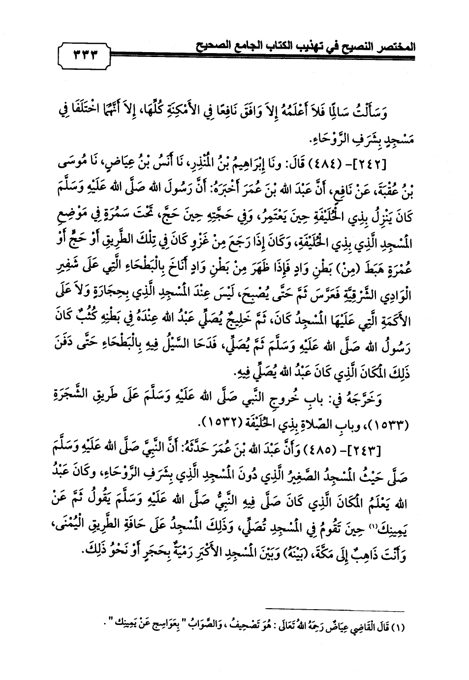 [242]- (484) قَالَ: ونَا إِبْرَاهِيمُ بْنُ الْمُنْذِرِ، نَا أَنَسُ بْنُ عِيَاضٍ، نَا مُوسَى بْنُ عُقْبَةَ، عَنْ نَافِعٍ، أَنَّ عَبْدَ الله بْنَ عُمَرَ أَخْبَرَهُ: أَنَّ رَسُولَ الله صَلَّى الله عَلَيْهِ وَسَلَّمَ كَانَ يَنْزِلُ بِذِي الْحُلَيْفَةِ حِينَ يَعْتَمِرُ، وَفِي حَجَّتِهِ حِينَ حَجَّ، تَحْتَ سَمُرَةٍ فِي مَوْضِعِ الْمَسْجِدِ الَّذِي بِذِي الْحُلَيْفَةِ، وَكَانَ إِذَا رَجَعَ مِنْ غَزْوٍ كَانَ فِي تِلْكَ الطَّرِيقِ أَوْ حَجٍّ أَوْ عُمْرَةٍ هَبَطَ (مِنْ) بَطْنِ وَادٍ فَإِذَا ظَهَرَ مِنْ بَطْنِ وَادٍ أَنَاخَ بِالْبَطْحَاءِ الَّتِي عَلَى شَفِيرِ الْوَادِي الشَّرْقِيَّةِ فَعَرَّسَ ثَمَّ حَتَّى يُصْبِحَ، لَيْسَ عِنْدَ الْمَسْجِدِ الَّذِي بِحِجَارَةٍ وَلاَ عَلَى الأَكَمَةِ الَّتِي عَلَيْهَا الْمَسْجِدُ كَانَ، ثَمَّ خَلِيجٌ يُصَلِّي عَبْدُ الله عِنْدَهُ فِي بَطْنِهِ كُثُبٌ كَانَ رَسُولُ الله صَلَّى الله عَلَيْهِ وَسَلَّمَ ثَمَّ يُصَلِّي، فَدَحَا السَّيْلُ فِيهِ بِالْبَطْحَاءِ حَتَّى دَفَنَ ذَلِكَ الْمَكَانَ الَّذِي كَانَ عَبْدُ الله يُصَلِّي فِيهِ.