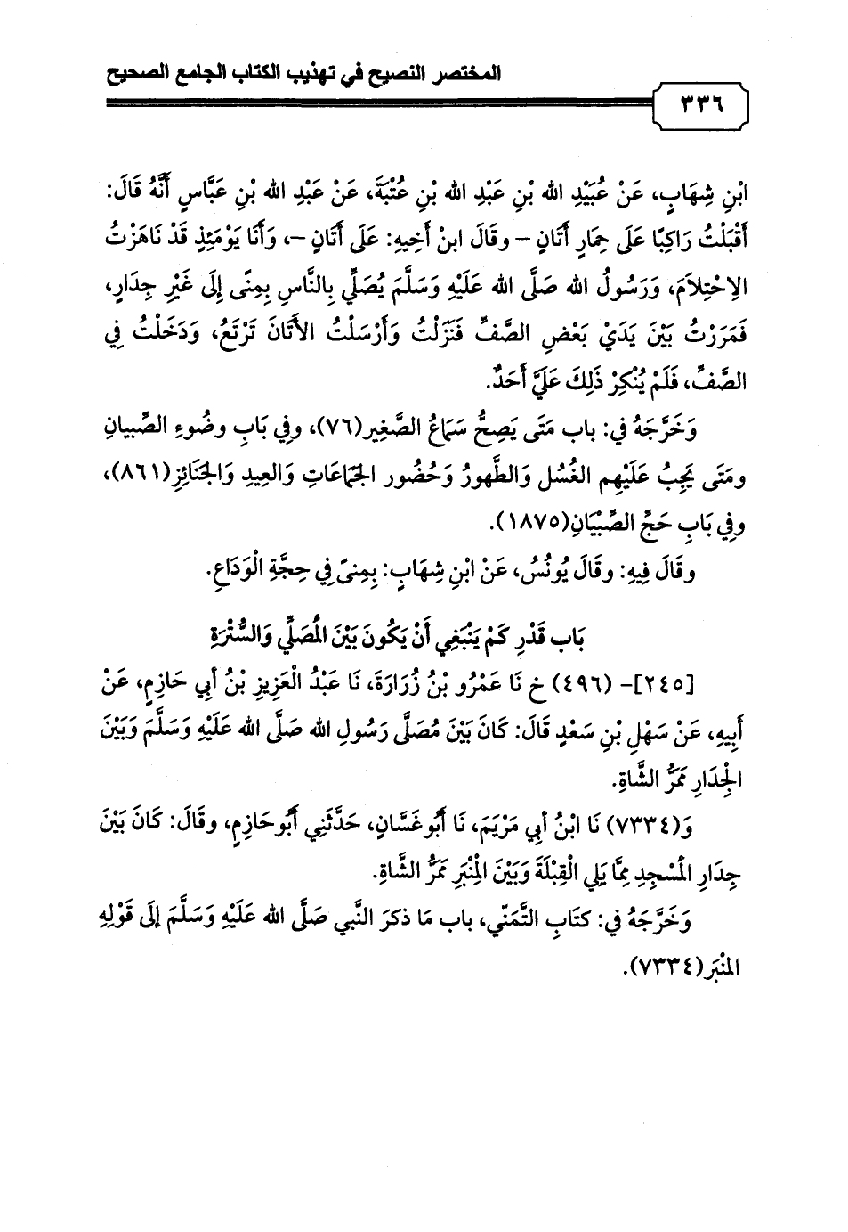 وَ (7334) نَا ابْنُ أبِي مَرْيَمَ، نَا أَبُوغَسَّانٍ، حَدَّثَنِي أَبُوحَازِمٍ، وقَالَ: كَانَ بَيْنَ جِدَارِ الْمَسْجِدِ مِمَّا يَلِي الْقِبْلَةَ وَبَيْنَ الْمِنْبَرِ مَمَرُّ الشَّاةِ.