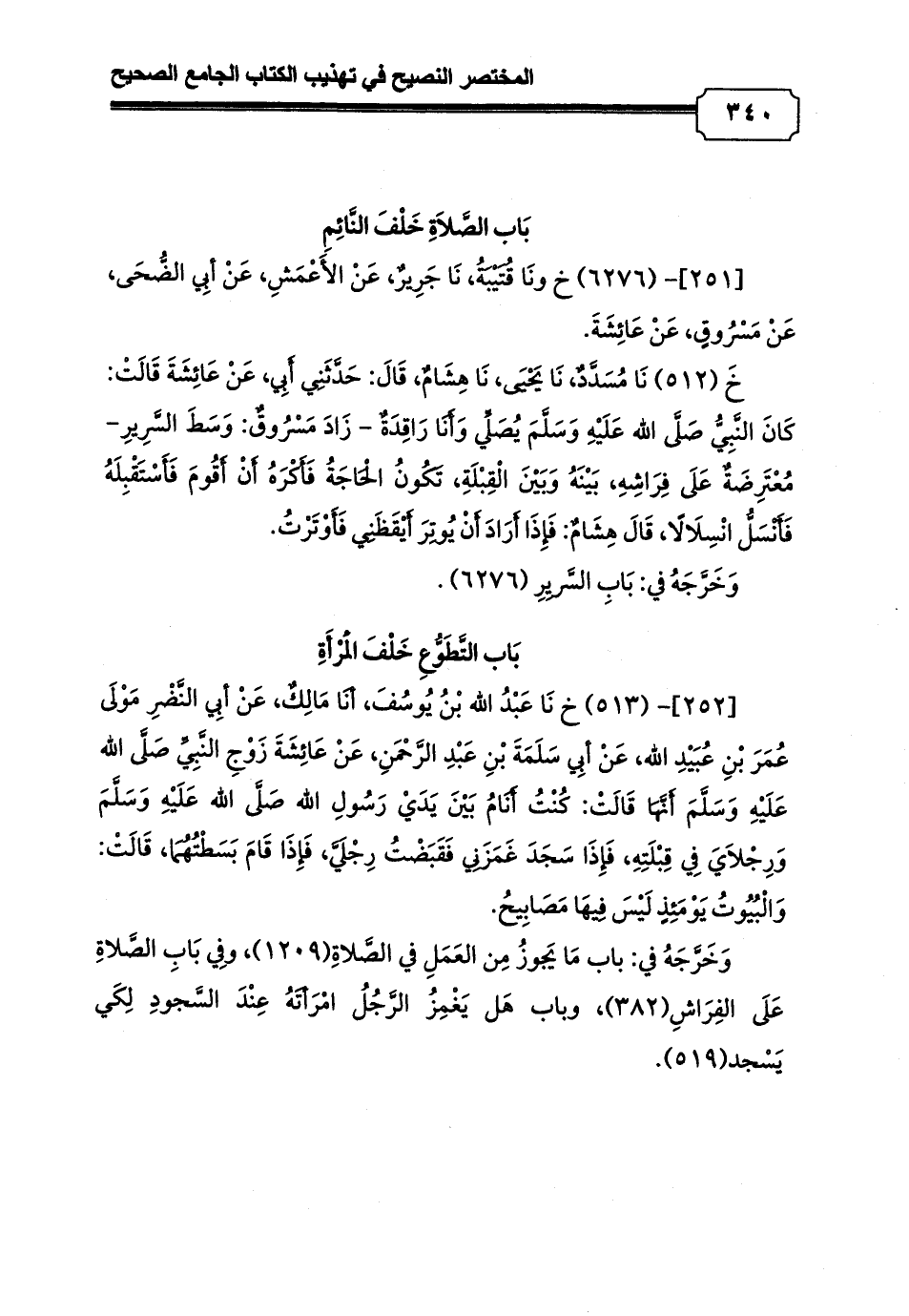 خَ (512) نَا مُسَدَّدٌ، نَا يَحْيَى، نَا هِشَامٌ، قَالَ: حَدَّثَنِي أَبِي، عَنْ عَائِشَةَ قَالَتْ: كَانَ النَّبِيُّ صَلَّى الله عَلَيْهِ وَسَلَّمَ يُصَلِّي وَأَنَا رَاقِدَةٌ - زَادَ مَسْرُوقٌ: وَسَطَ السَّرِيرِ- مُعْتَرِضَةٌ عَلَى فِرَاشِهِ, بَيْنَهُ وَبَيْنَ الْقِبْلَةِ، تَكُونُ الْحَاجَةُ فَأَكْرَهُ أَنْ أَقُومَ فَأَسْتَقْبِلَهُ فَأَنْسَلُّ انْسِلَالًا، قَالَ هِشَامٌ: فَإِذَا أَرَادَ أَنْ يُوتِرَ أَيْقَظَنِي فَأَوْتَرْتُ.