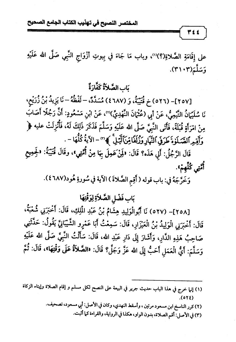 [257]- (526) خ قُتَيْبَةُ، وَ (4687) مُسَدَّدٌ، - لَفْظُهُ - نَا يَزِيدُ بْنُ زُرَيْعٍ، نَا سُلَيْمَانُ التَّيْمِيُّ، عَنْ أبِي (عُثْمَانَ النَّهْدِيِّ) (¬2)، عَنْ ابْنِ مَسْعُودٍ: أَنَّ رَجُلًا أَصَابَ مِنْ امْرَأَةٍ قُبْلَةً، فَأَتَى النَّبِيَّ صَلَّى الله عَلَيْهِ وَسَلَّمَ فَذَكَرَ ذَلِكَ لَهُ, فَأُنْزِلَتْ عليه {وَأَقِمِ الصَّلَاةَ طَرَفَيِ النَّهَارِ وَزُلَفًا مِنَ اللَّيْلِ} (¬3) - الآيةُ كُلُّهَا -.