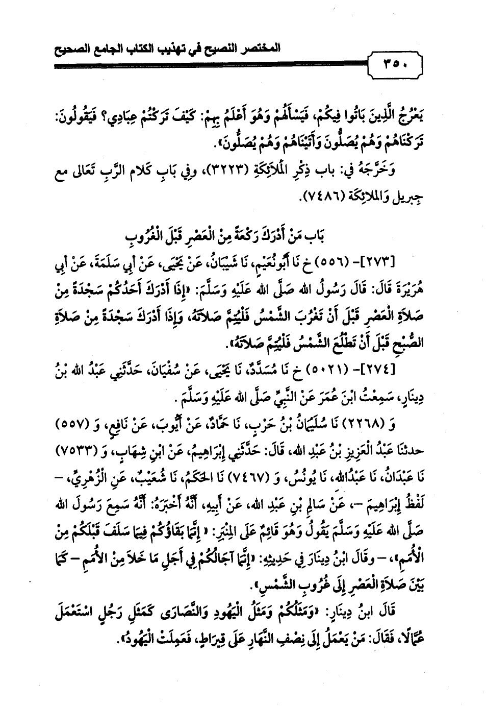 وَ (2268) نَا سُلَيْمَانُ بْنُ حَرْبٍ، نَا حَمَّادٌ، عَنْ أَيُّوبَ، عَنْ نَافِعٍ, وَ (557) حدثنَا عَبْدُ الْعَزِيزِ بْنُ عَبْدِ الله، قَالَ: حَدَّثَنِي إِبْرَاهِيمُ، عَنْ ابْنِ شِهَابٍ, وَ (7533) نَا عَبْدَانُ، نَا عَبْدُاللهِ، نَا يُونُسُ، وَ (7467) نَا الحَكَمُ، نَا شُعَيْبٌ، عَنِ الْزُهْرِيِّ، - لَفْظُ إِبْرَاهِيمَ -, عَنْ سَالِمِ بْنِ عَبْدِ الله، عَنْ أَبِيهِ، أَنَّهُ أَخْبَرَهُ: أَنَّهُ سَمِعَ رَسُولَ الله صَلَّى الله عَلَيْهِ وَسَلَّمَ يَقُولُ وَهُوَ قَائِمٌ عَلَى المِنْبَرِ: «إِنَّمَا بَقَاؤُكُمْ فِيمَا سَلَفَ قَبْلَكُمْ مِنْ الْأُمَمِ» , - وقَالَ ابْنُ دِينَارَ فِي حَدِيثِهِ: «إِنَّمَا آجَالُكُمْ فِي أَجَلِ مَا خَلاَ مِنْ الأُمَمِ - كَمَا بَيْنَ صَلاَةِ الْعَصْرِ إِلَى غُرُوبِ الشَّمْسِ».
