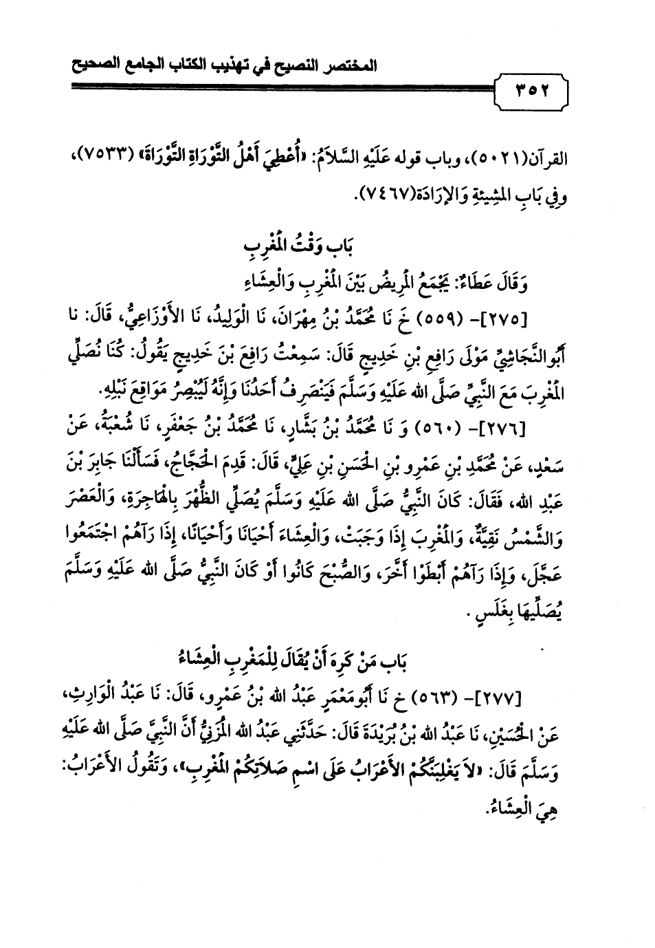 [277]- (563) خ نَا أَبُومَعْمَرٍ عَبْدُ الله بْنُ عَمْرٍو، قَالَ: نَا عَبْدُ الْوَارِثِ، عَنْ الْحُسَيْنِ، نَا عَبْدُ الله بْنُ بُرَيْدَةَ قَالَ: حَدَّثَنِي عَبْدُ الله الْمُزَنِيُّ أَنَّ النَّبِيَّ صَلَّى الله عَلَيْهِ وَسَلَّمَ قَالَ: «لاَ يَغْلِبَنَّكُمْ الأَعْرَابُ عَلَى اسْمِ صَلاَتِكُمْ الْمَغْرِبِ»، وَتَقُولُ الأَعْرَابُ: هِيَ الْعِشَاءُ.