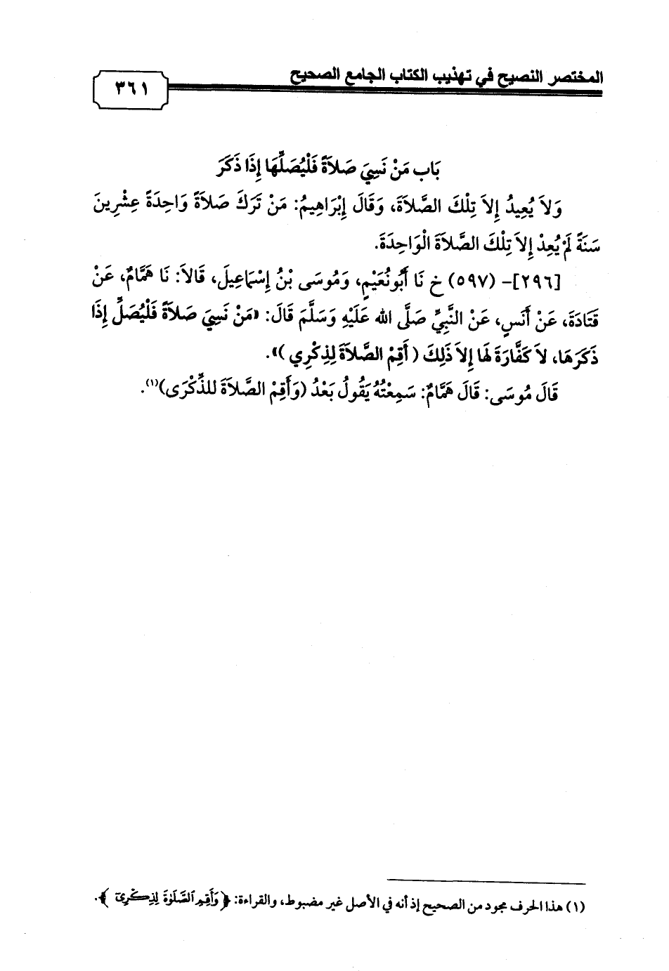 [296]- (597) خ نَا أَبُونُعَيْمٍ، وَمُوسَى بْنُ إِسْمَاعِيلَ، قَالاَ: نَا هَمَّامٌ، عَنْ قَتَادَةَ، عَنْ أَنَسٍ، عَنْ النَّبِيِّ صَلَّى الله عَلَيْهِ وَسَلَّمَ قَالَ: «مَنْ نَسِيَ صَلاَةً فَلْيُصَلِّ إِذَا ذَكَرَهَا، لاَ كَفَّارَةَ لَهَا إِلاَ ذَلِكَ (أَقِمْ الصَّلاَةَ لِذِكْرِي)».