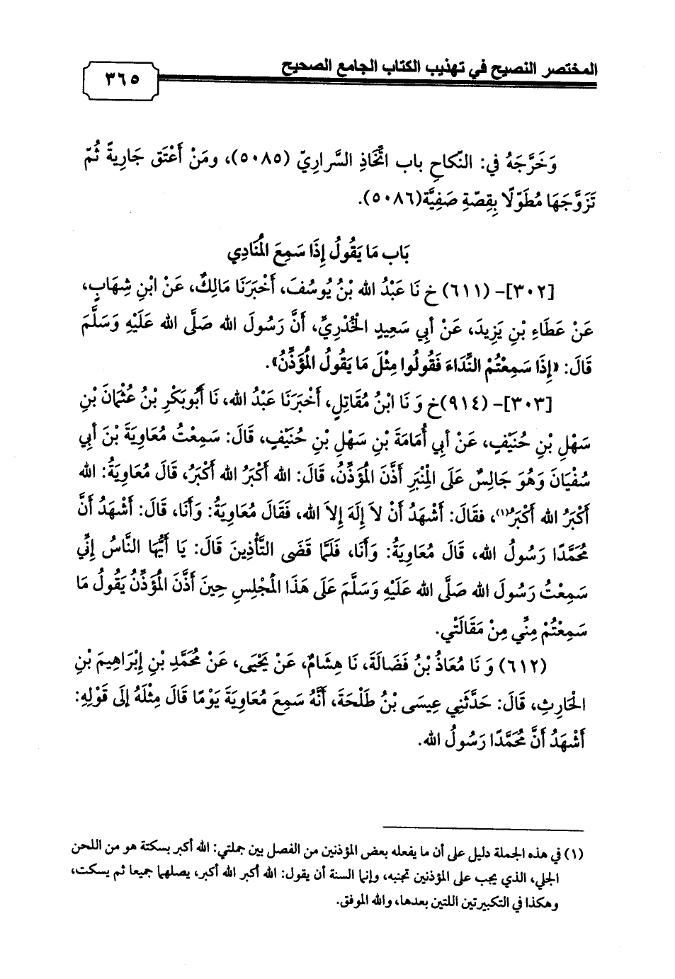 [303]- (914) خ وَنَا ابْنُ مُقَاتِلٍ، أَخْبَرَنَا عَبْدُ الله، نَا أَبُوبَكْرِ بْنُ عُثْمَانَ بْنِ سَهْلِ بْنِ حُنَيْفٍ، عَنْ أبِي أُمَامَةَ بْنِ سَهْلِ بْنِ حُنَيْفٍ، قَالَ: سَمِعْتُ مُعَاوِيَةَ بْنَ أبِي سُفْيَانَ وَهُوَ جَالِسٌ عَلَى الْمِنْبَرِ أَذَّنَ الْمُؤَذِّنُ، قَالَ: الله أَكْبَرُ الله أَكْبَرُ، قَالَ مُعَاوِيَةُ: الله أَكْبَرُ الله أَكْبَرُ (¬1)، فقَالَ: أَشْهَدُ أَنْ لاَ إِلَهَ إِلاَ الله، فَقَالَ مُعَاوِيَةُ: وَأَنَا، قَالَ: أَشْهَدُ أَنَّ مُحَمَّدًا رَسُولُ الله، قَالَ مُعَاوِيَةُ: وَأَنَا، فَلَمَّا قَضَى التَّأْذِينَ قَالَ: يَا أَيُّهَا النَّاسُ إِنِّي سَمِعْتُ رَسُولَ الله صَلَّى الله عَلَيْهِ وَسَلَّمَ عَلَى هَذَا الْمَجْلِسِ حِينَ أَذَّنَ الْمُؤَذِّنُ يَقُولُ مَا سَمِعْتُمْ مِنِّي مِنْ مَقَالَتْي.