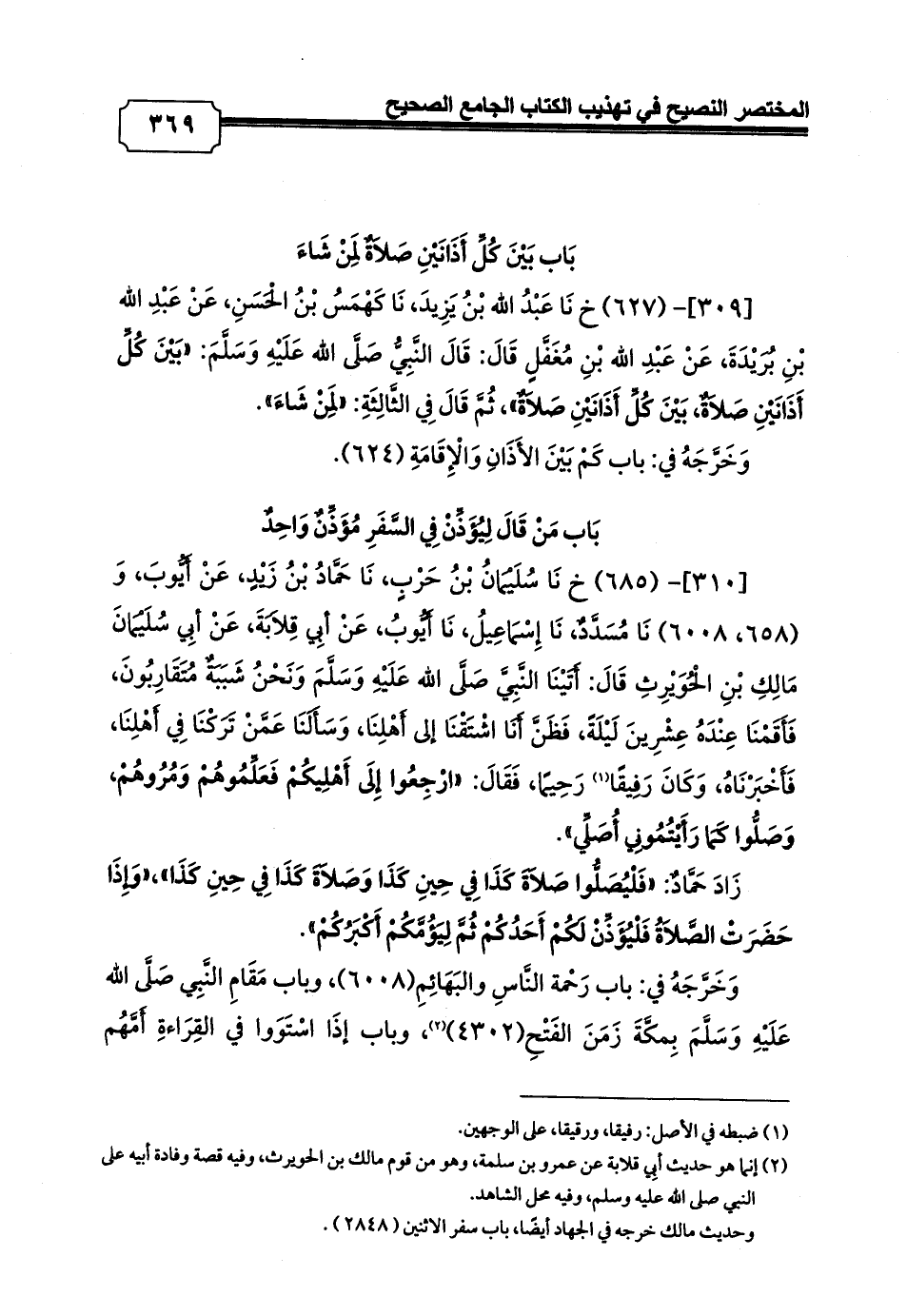 [310]- (685) خ نَا سُلَيْمَانُ بْنُ حَرْبٍ، نَا حَمَّادُ بْنُ زَيْدٍ، عَنْ أَيُّوبَ، وَ (658, 6008) نَا مُسَدَّدٌ، نَا إِسْمَاعِيلُ، نَا أَيُّوبُ، عَنْ أبِي قِلاَبَةَ، عَنْ أبِي سُلَيْمَانَ مَالِكِ بْنِ الْحُوَيْرِثِ قَالَ: أَتَيْنَا النَّبِيَّ صَلَّى الله عَلَيْهِ وَسَلَّمَ وَنَحْنُ شَبَبَةٌ مُتَقَارِبُونَ، فَأَقَمْنَا عِنْدَهُ عِشْرِينَ لَيْلَةً، فَظَنَّ أَنَا اشْتَقْنَا إلى أَهْلِنَا، وَسَأَلَنَا عَمَّنْ تَرَكْنَا فِي أَهْلِنَا، فَأَخْبَرْنَاهُ، وَكَانَ رَفِيقًا (¬1) رَحِيمًا، فَقَالَ: «ارْجِعُوا إِلَى أَهْلِيكُمْ فَعَلِّمُوهُمْ وَمُرُوهُمْ، وَصَلُّوا كَمَا رَأَيْتُمُونِي أُصَلِّي».