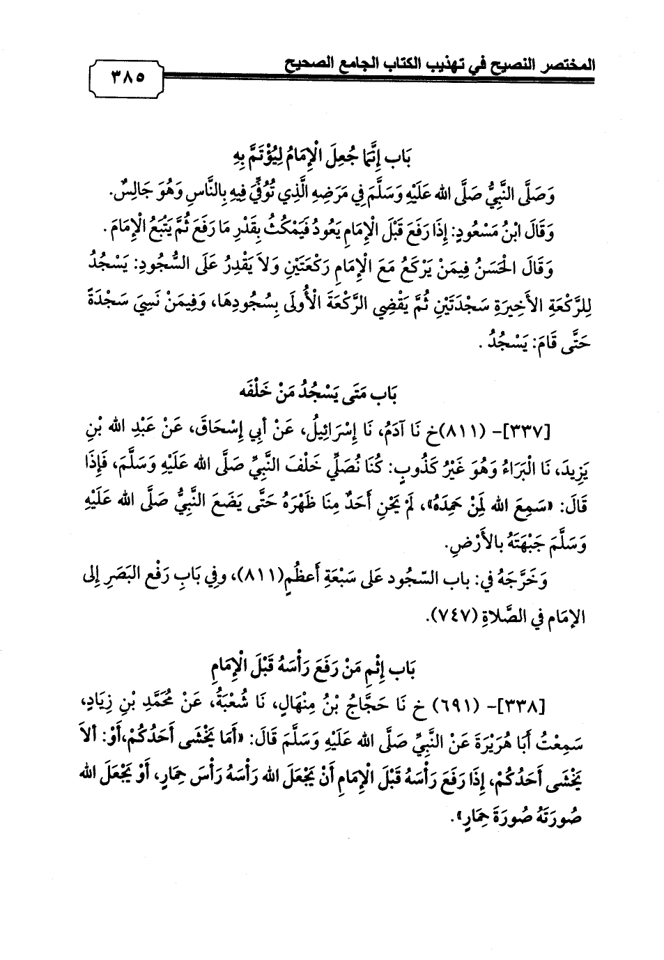 [338]- (691) خ نَا حَجَّاجُ بْنُ مِنْهَالٍ، نَا شُعْبَةُ، عَنْ مُحَمَّدِ بْنِ زِيَادٍ، سَمِعْتُ أَبَا هُرَيْرَةَ عَنْ النَّبِيِّ صَلَّى الله عَلَيْهِ وَسَلَّمَ قَالَ: «أَمَا يَخْشَى أَحَدُكُمْ, أَوْ: ألاَ يَخْشَى أَحَدُكُمْ، إِذَا رَفَعَ رَأْسَهُ قَبْلَ الْإِمَامِ أَنْ يَجْعَلَ الله رَأْسَهُ رَأْسَ حِمَارٍ، أَوْ يَجْعَلَ الله صُورَتَهُ صُورَةَ حِمَارٍ».