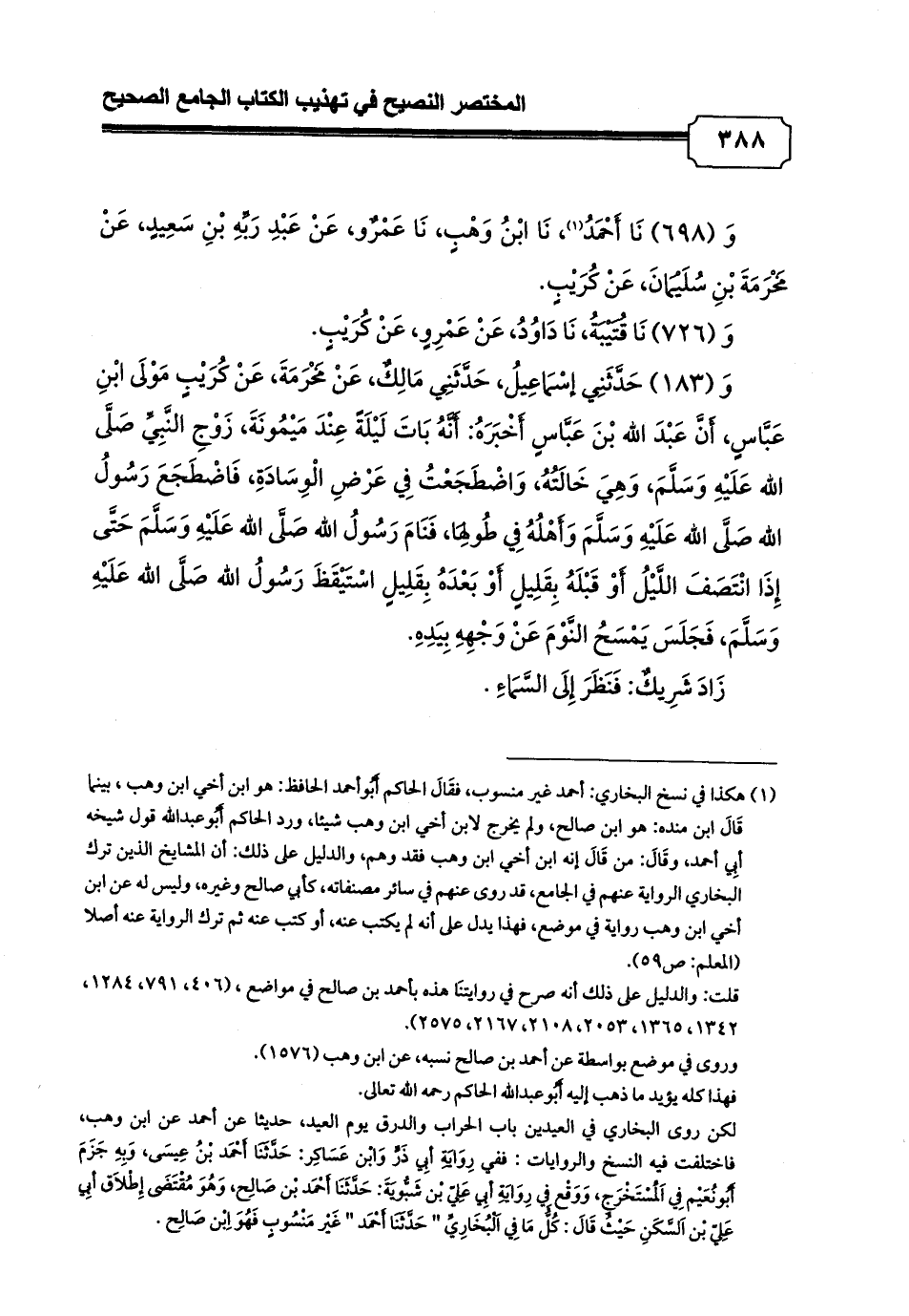 (¬1) هكذا في نسخ البخاري: أحمد غير منسوب، فقَالَ الحاكم أَبُوأحمد الحافظ: هو ابن أخي ابن وهب، بينما قَالَ ابن منده: هو ابن صالح، ولم يخرج لابن أخي ابن وهب شيئا، ورد الحاكم أَبُوعبد الله قول شيخه أبِي أحمد، وقَالَ: من قَالَ إنه ابن أخي ابن وهب فقد وهم، والدليل على ذلك: أن المشايخ الذين ترك البخاري الرواية عنهم في الجامع، قد روى عنهم في سائر مصنفاته، كأبي صالح وغيره، وليس له عن ابن أخي ابن وهب رواية في موضع، فهذا يدل على أنه لم يكتب عنه، أو كتب عنه ثم ترك الرواية عنه أصلا (المعلم: ص59).