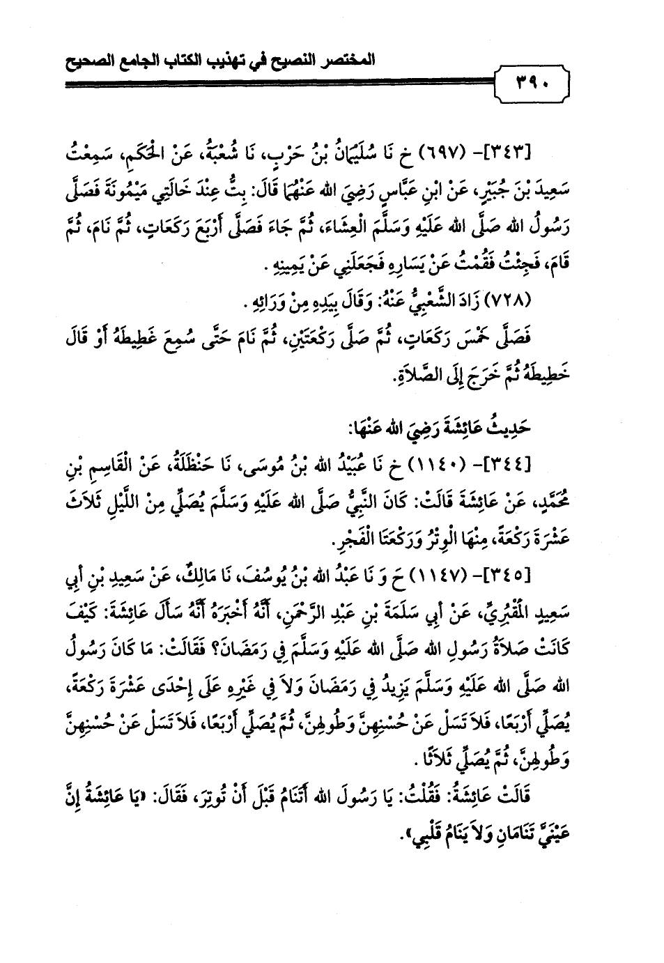 [345]- (1147) حَ وَنَا عَبْدُ الله بْنُ يُوسُفَ، نَا مَالِكٌ، عَنْ سَعِيدِ بْنِ أبِي سَعِيدٍ الْمَقْبُرِيِّ، عَنْ أبِي سَلَمَةَ بْنِ عَبْدِ الرَّحْمَنِ، أَنَّهُ أَخْبَرَهُ أَنَّهُ سَأَلَ عَائِشَةَ: كَيْفَ كَانَتْ صَلاَةُ رَسُولِ الله صَلَّى الله عَلَيْهِ وَسَلَّمَ فِي رَمَضَانَ؟ فَقَالَتْ: مَا كَانَ رَسُولُ الله صَلَّى الله عَلَيْهِ وَسَلَّمَ يَزِيدُ فِي رَمَضَانَ وَلاَ فِي غَيْرِهِ عَلَى إِحْدَى عَشْرَةَ رَكْعَةً، يُصَلِّي أَرْبَعًا، فَلاَ تَسَلْ عَنْ حُسْنِهِنَّ وَطُولِهِنَّ، ثُمَّ يُصَلِّي أَرْبَعًا، فَلاَ تَسَلْ عَنْ حُسْنِهِنَّ وَطُولِهِنَّ، ثُمَّ يُصَلِّي ثَلاَثًا.