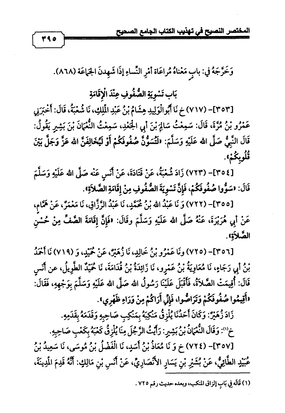 [354]- (723) زَادَ شُعْبَةُ، عَنْ قَتَادَةَ، عَنْ أَنَسٍ عَنْه صَلَّى الله عَلَيْهِ وَسَلَّمَ قَالَ: «سَوُّوا صُفُوفَكُمْ، فَإِنَّ تَسْوِيَةَ الصُّفُوفِ مِنْ إِقَامَةِ الصَّلاَةِ».