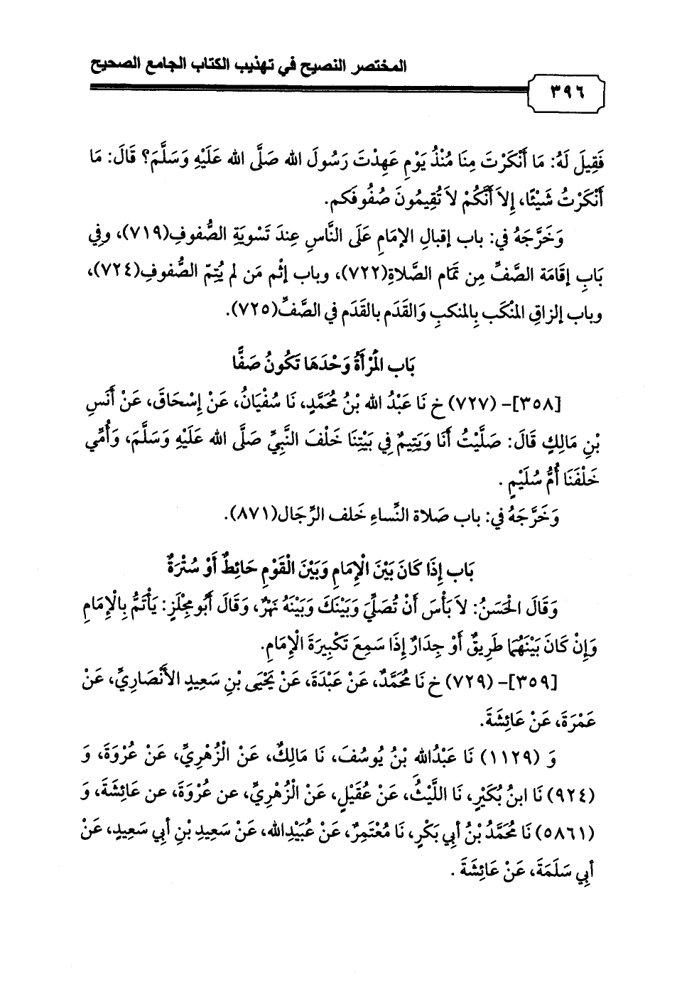 [358]- (727) خ نَا عَبْدُ الله بْنُ مُحَمَّدٍ، نَا سُفْيَانُ، عَنْ إِسْحَاقَ، عَنْ أَنَسِ بْنِ مَالِكٍ قَالَ: صَلَّيْتُ أَنَا وَيَتِيمٌ فِي بَيْتِنَا خَلْفَ النَّبِيِّ صَلَّى الله عَلَيْهِ وَسَلَّمَ، وَأُمِّي خَلْفَنَا أُمُّ سُلَيْمٍ.