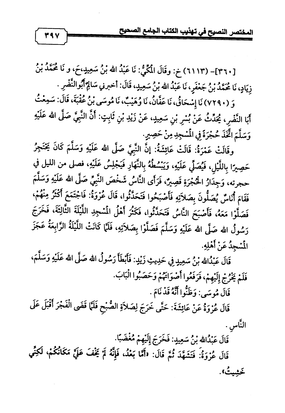 وَ (7290) نَا إِسْحَاقُ، نَا عَفَّانُ، نَا وُهَيْبٌ، نَا مُوسَى بْنُ عُقْبَةَ، قَالَ: سَمِعْتُ أَبَا النَّضْرِ، يُحَدِّثُ عَنْ بُسْرِ بْنِ سَعِيدٍ، عَنْ زَيْدِ بْنِ ثَابِتٍ: أَنَّ النَّبِيَّ صَلَّى الله عَلَيْهِ وَسَلَّمَ اتَّخَذَ حُجْرَةً فِي الْمَسْجِدِ مِنْ حَصِيرٍ.