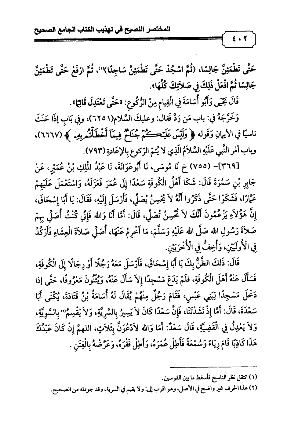 [369]- (755) خ نَا مُوسَى، نَا أَبُوعَوَانَةَ، نَا عَبْدُ الْمَلِكِ بْنُ عُمَيْرٍ، عَنْ جَابِرِ بْنِ سَمُرَةَ قَالَ: شَكَا أَهْلُ الْكُوفَةِ سَعْدًا إِلَى عُمَرَ فَعَزَلَهُ، وَاسْتَعْمَلَ عَلَيْهِمْ عَمَّارًا، فَشَكَوْا حَتَّى ذَكَرُوا أَنَّهُ لاَ يُحْسِنُ يُصَلِّي، فَأَرْسَلَ إِلَيْهِ، فَقَالَ: يَا أَبَا إِسْحَاقَ، إِنَّ هَؤُلاَءِ يَزْعُمُونَ أَنَّكَ لاَ تُحْسِنُ تُصَلِّي، قَالَ: أَمَّا أَنَا وَالله فَإِنِّي كُنْتُ أُصَلِّي بِهِمْ صَلاَةَ رَسُولِ الله صَلَّى الله عَلَيْهِ وَسَلَّمَ، مَا أَخْرِمُ عَنْهَا، أُصَلِّي صَلاَةَ الْعِشَاءِ فَأَرْكُدُ فِي الْأُولَيَيْنِ، وَأُخِفُّ فِي الْأُخْرَيَيْنِ.