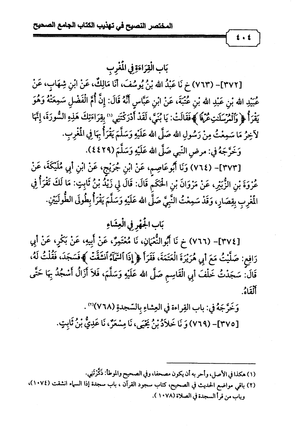 [372]- (763) خ نَا عَبْدُ الله بْنُ يُوسُفَ، أنَا مَالِكٌ، عَنْ ابْنِ شِهَابٍ، عَنْ عُبَيْدِ الله بْنِ عَبْدِ الله بْنِ عُتْبَةَ، عَنْ ابْنِ عَبَّاسٍ أَنَّهُ قَالَ: إِنَّ أُمَّ الْفَضْلِ سَمِعَتْهُ وَهُوَ يَقْرَأُ {وَالْمُرْسَلَاتِ عُرْفًا} فَقَالَتْ: يَا بُنَيَّ, لَقَدْ أَدْرَكْتَنِي (¬1) بِقِرَاءَتِكَ هَذِهِ السُّورَةَ، إِنَّهَا لآخِرُ مَا سَمِعْتُ مِنْ رَسُولِ الله صَلَّى الله عَلَيْهِ وَسَلَّمَ يَقْرَأُ بِهَا فِي الْمَغْرِبِ.