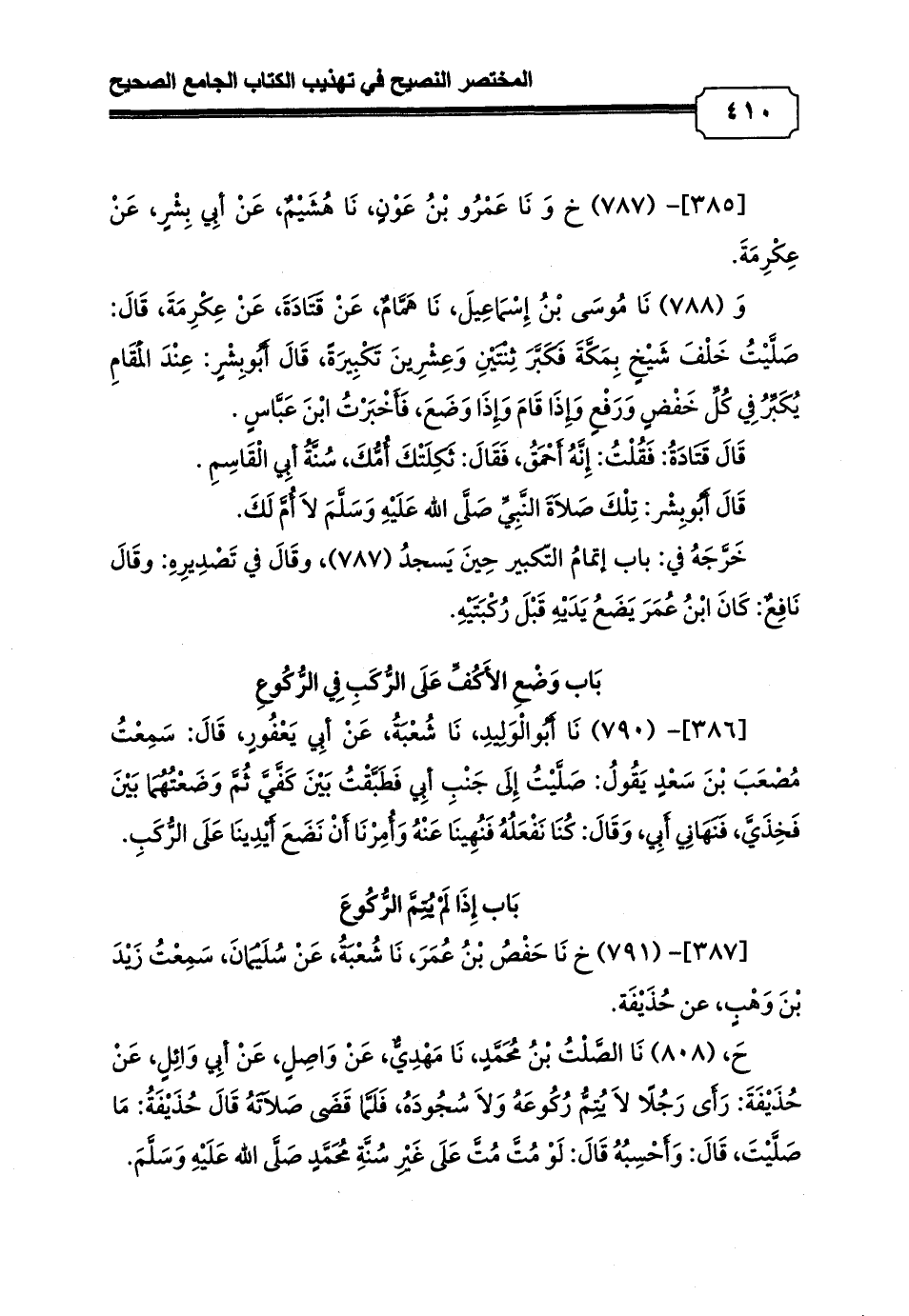 حَ, (808) نَا الصَّلْتُ بْنُ مُحَمَّدٍ، نَا مَهْدِيٌّ، عَنْ وَاصِلٍ، عَنْ أبِي وَائِلٍ، عَنْ حُذَيْفَةَ: رَأَى رَجُلًا لاَ يُتِمُّ رُكُوعَهُ وَلاَ سُجُودَهُ، فَلَمَّا قَضَى صَلاَتَهُ قَالَ حُذَيْفَةُ: مَا صَلَّيْتَ, قَالَ: وَأَحْسِبُهُ قَالَ: لَوْ مُتَّ مُتَّ عَلَى غَيْرِ سُنَّةِ مُحَمَّدٍ صَلَّى الله عَلَيْهِ وَسَلَّمَ.