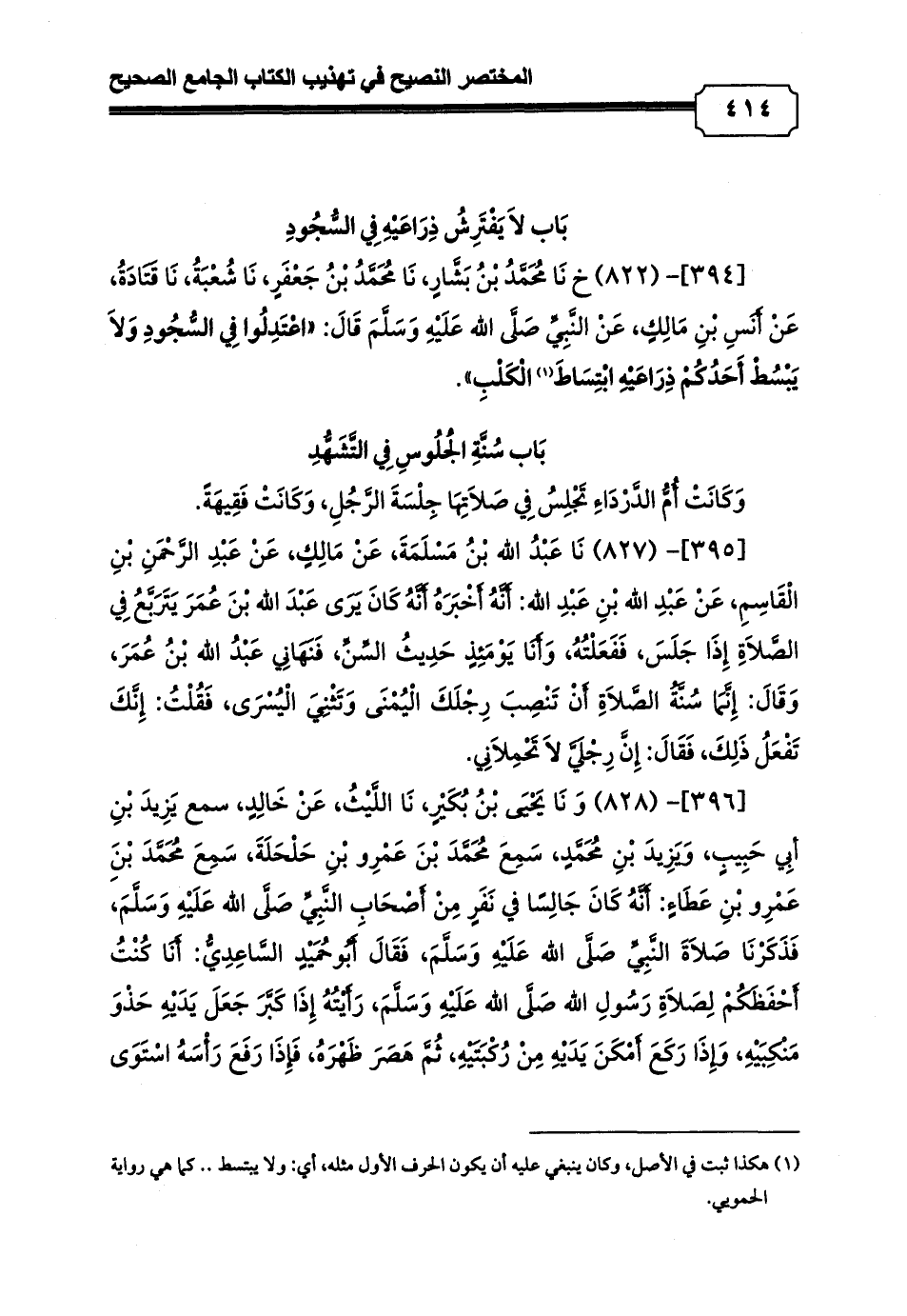 [394]- (822) خ نَا مُحَمَّدُ بْنُ بَشَّارٍ، نَا مُحَمَّدُ بْنُ جَعْفَرٍ، نَا شُعْبَةُ، نَا قَتَادَةُ، عَنْ أَنَسِ بْنِ مَالِكٍ، عَنْ النَّبِيِّ صَلَّى الله عَلَيْهِ وَسَلَّمَ قَالَ: «اعْتَدِلُوا فِي السُّجُودِ وَلاَ يَبْسُطْ أَحَدُكُمْ ذِرَاعَيْهِ ابْتِِسَاطَ (¬1) الْكَلْبِ».
