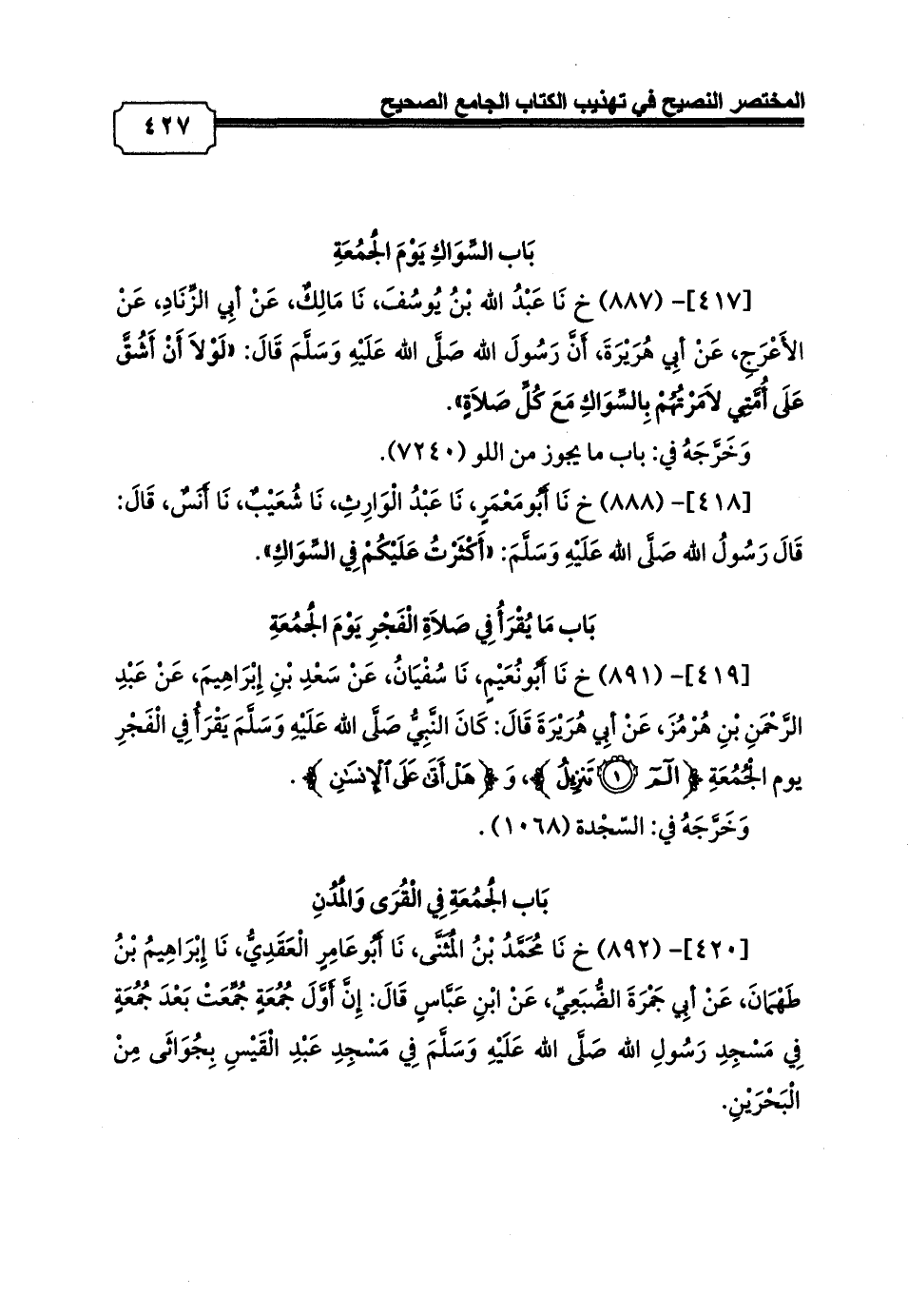 [419]- (891) خ نَا أَبُونُعَيْمٍ، نَا سُفْيَانُ، عَنْ سَعْدِ بْنِ إِبْرَاهِيمَ، عَنْ عَبْدِ الرَّحْمَنِ بْنِ هُرْمُزَ، عَنْ أبِي هُرَيْرَةَ قَالَ: كَانَ النَّبِيُّ صَلَّى الله عَلَيْهِ وَسَلَّمَ يَقْرَأُ فِي الْفَجْرِ يوم الْجُمُعَةِ {الم (1) تَنْزِيلُ} , وَ {هَلْ أَتَى عَلَى الْإِنْسَانِ}.