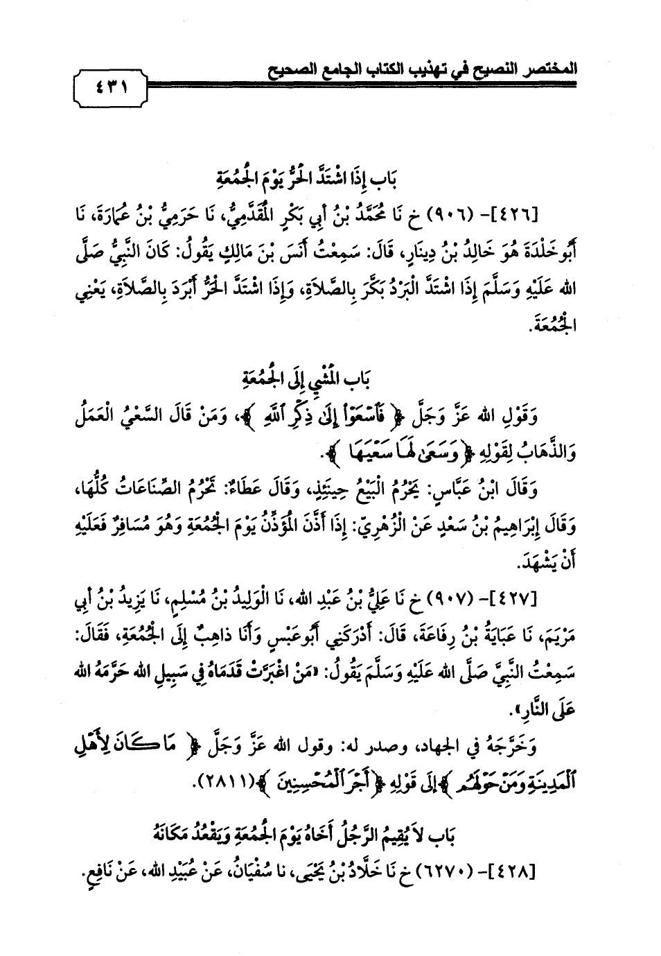 [426]- (906) خ نَا مُحَمَّدُ بْنُ أبِي بَكْرٍ الْمُقَدَّمِيُّ، نَا حَرَمِيُّ بْنُ عُمَارَةَ، نَا أَبُوخَلْدَةَ هُوَ خَالِدُ بْنُ دِينَارٍ، قَالَ: سَمِعْتُ أَنَسَ بْنَ مَالِكٍ يَقُولُ: كَانَ النَّبِيُّ صَلَّى الله عَلَيْهِ وَسَلَّمَ إِذَا اشْتَدَّ الْبَرْدُ بَكَّرَ بِالصَّلاَةِ، وَإِذَا اشْتَدَّ الْحَرُّ أَبْرَدَ بِالصَّلاَةِ, يَعْنِي الْجُمُعَةَ.