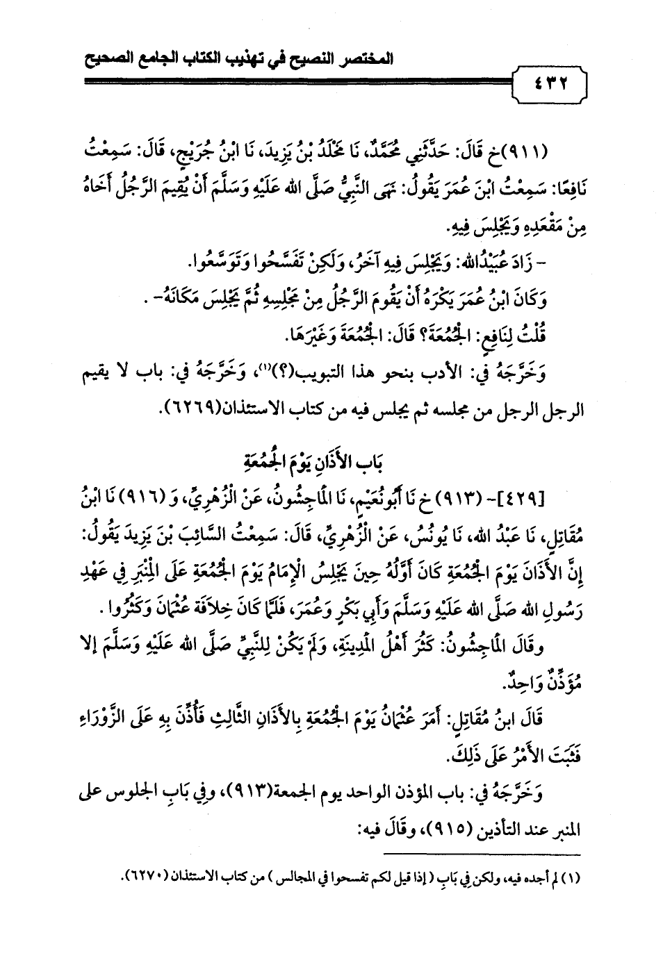 [429]- (913) خ نَا أَبُونُعَيْمٍ، نَا الْمَاجِشُونُ، عَنْ الْزُهْرِيِّ، وَ (916) نَا ابْنُ مُقَاتِلٍ، نَا عَبْدُ الله، نَا يُونُسُ، عَنْ الْزُهْرِيِّ، قَالَ: سَمِعْتُ السَّائِبَ بْنَ يَزِيدَ يَقُولُ: إِنَّ الأَذَانَ يَوْمَ الْجُمُعَةِ كَانَ أَوَّلُهُ حِينَ يَجْلِسُ الْإِمَامُ يَوْمَ الْجُمُعَةِ عَلَى الْمِنْبَرِ فِي عَهْدِ رَسُولِ الله صَلَّى الله عَلَيْهِ وَسَلَّمَ وَأَبِي بَكْرٍ وَعُمَرَ, فَلَمَّا كَانَ خِلاَفَة عُثْمَانَ وَكَثُرُوا.
