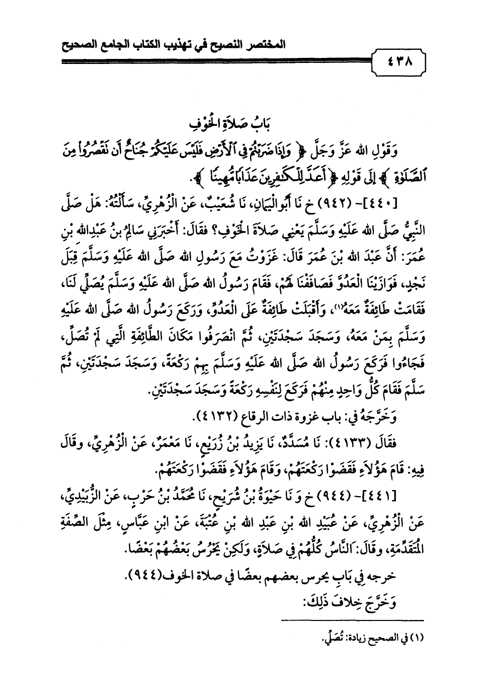 [441]- (944) خ وَنَا حَيْوَةُ بْنُ شُرَيْحٍ، نَا مُحَمَّدُ بْنُ حَرْبٍ، عَنْ الزُّبَيْدِيِّ، عَنْ الْزُهْرِيِّ، عَنْ عُبَيْدِ الله بْنِ عَبْدِ الله بْنِ عُتْبَةَ، عَنْ ابْنِ عَبَّاسٍ، مِثْلَ الصِّفَةِ الْمُتَقَدِّمَةِ، وقَالَ: َالنَّاسُ كُلُّهُمْ فِي صَلاَةٍ، وَلَكِنْ يَحْرُسُ بَعْضُهُمْ بَعْضًا.