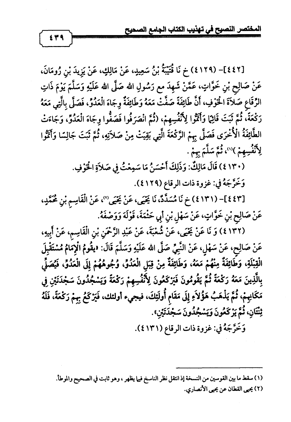 [442]- (4129) خ نَا قُتَيْبَةُ بْنُ سَعِيدٍ، عَنْ مَالِكٍ، عَنْ يَزِيدَ بْنِ رُومَانَ، عَنْ صَالِحِ بْنِ خَوَّاتٍ، عَمَّنْ شَهِدَ مع رَسُولِ الله صَلَّى الله عَلَيْهِ وَسَلَّمَ يَوْمَ ذَاتِ الرِّقَاعِ صَلاَةَ الْخَوْفِ، أَنَّ طَائِفَةً صَفَّتْ مَعَهُ وَطَائِفَةٌ وِجَاهَ الْعَدُوِّ، فَصَلَّى بِالَّتِي مَعَهُ رَكْعَةً، ثُمَّ ثَبَتَ قَائِمًا وَأَتَمُّوا لِأَنْفُسِهِمْ، (ثُمَّ انْصَرَفُوا فَصَفُّوا وِجَاهَ الْعَدُوِّ، وَجَاءَتْ الطَّائِفَةُ الْأُخْرَى فَصَلَّى بِهِمْ الرَّكْعَةَ الَّتِي بَقِيَتْ مِنْ صَلاَتِهِ، ثُمَّ ثَبَتَ جَالِسًا وَأَتَمُّوا لِأَنْفُسِهِمْ) (¬1) , ثُمَّ سَلَّمَ بِهِمْ.