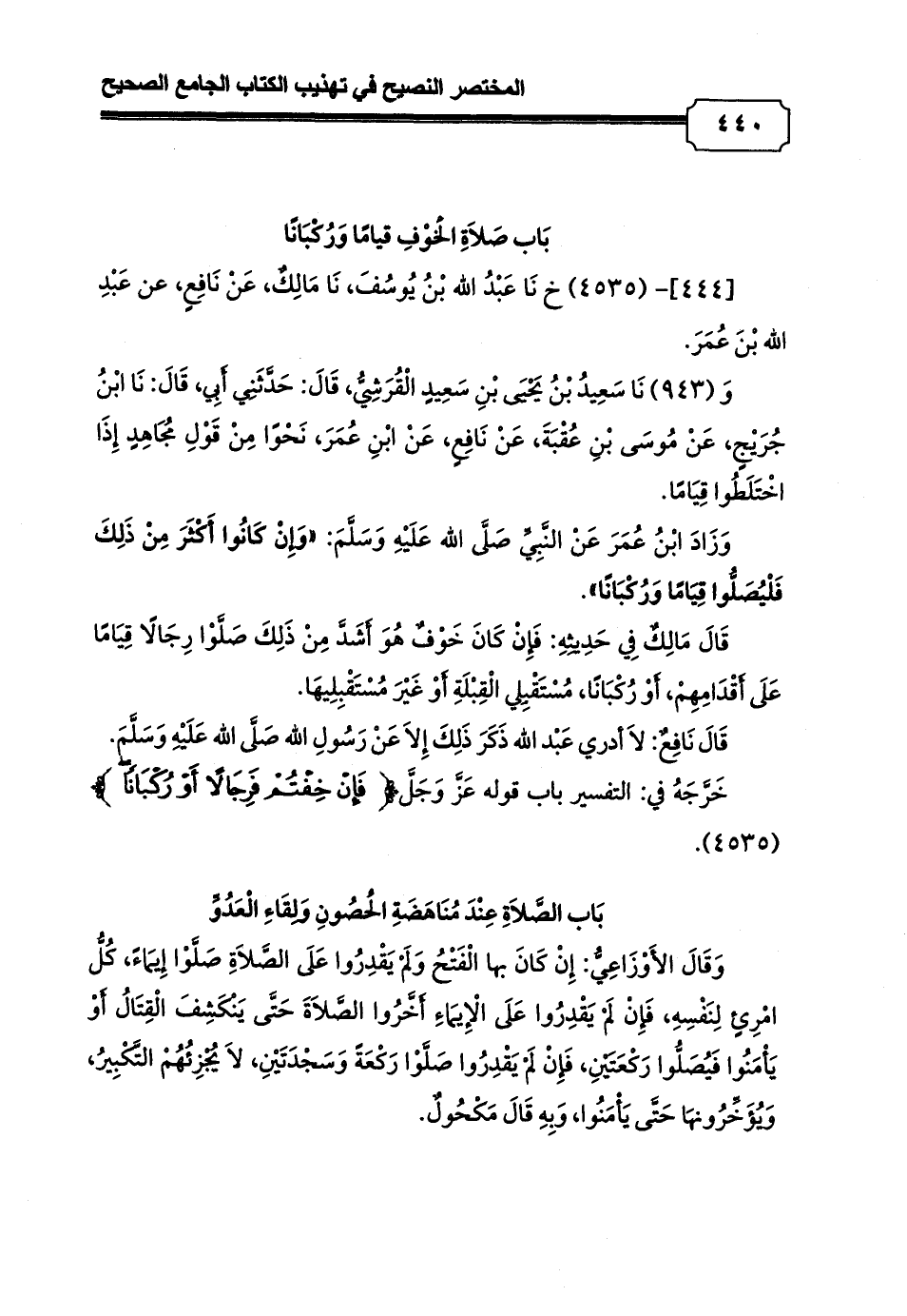 [444]- (4535) خ نَا عَبْدُ الله بْنُ يُوسُفَ، نَا مَالِكٌ، عَنْ نَافِعٍ، عن عَبْدِ الله بْنَ عُمَرَ.