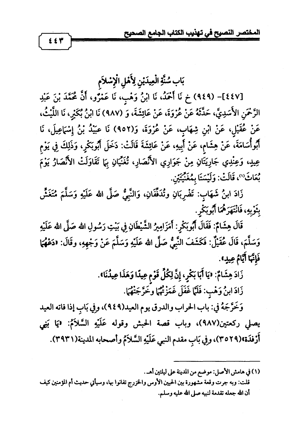 [447]- (949) خ نَا أَحْمَدُ، نَا ابْنُ وَهْبٍ، نَا عَمْرٌو، أَنَّ مُحَمَّدَ بْنَ عَبْدِ الرَّحْمَنِ الأَسَدِيَّ، حَدَّثَهُ عَنْ عُرْوَةَ، عَنْ عَائِشَةَ، وَ (987) نَا ابْنُ بُكَيْرٍ، نَا اللَّيْثُ، عَنْ عُقَيْلٍ، عَنْ ابْنِ شِهَابٍ، عَنْ عُرْوَةَ، وَ (952) نَا عبَيْدُ بْنُ إِسْمَاعِيلَ، نَا أَبُوأُسَامَةَ، عَنْ هِشَامٍ، عَنْ أَبِيهِ، عَنْ عَائِشَةَ قَالَتْ: دَخَلَ أَبُوبَكْرٍ، وَذَلِكَ فِي يَوْمِ عِيدٍ، وَعِنْدِي جَارِيَتَانِ مِنْ جَوَارِي الأَنْصَارِ، تُغَنِّيَانِ بِمَا تَقَاوَلَتْ الأَنْصَارُ يَوْمَ بُعَاثَ (¬1)، قَالَتْ: وَلَيْسَتَا بِمُغَنِّيَتَيْنِ.