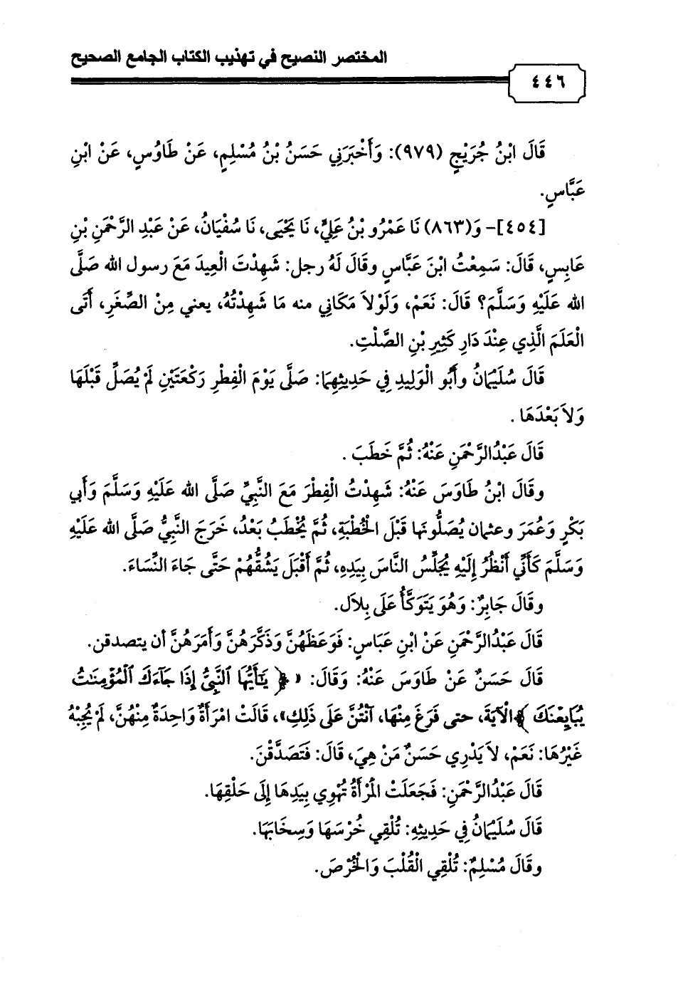 [454]- وَ (863) نَا عَمْرُو بْنُ عَلِيٍّ، نَا يَحْيَى، نَا سُفْيَانُ، عَنْ عَبْدِ الرَّحْمَنِ بْنِ عَابِسٍ، قَالَ: سَمِعْتُ ابْنَ عَبَّاسٍ وقَالَ لَهُ رجل: شَهِدْتَ الْعِيدَ مَعَ رسول الله صَلَّى الله عَلَيْهِ وَسَلَّمَ؟ قَالَ: نَعَمْ، وَلَوْلاَ مَكَانِي منه مَا شَهِدْتُهُ، يعني مِنْ الصِّغَرِ، أَتَى الْعَلَمَ الَّذِي عِنْدَ دَارِ كَثِيرِ بْنِ الصَّلْتِ.