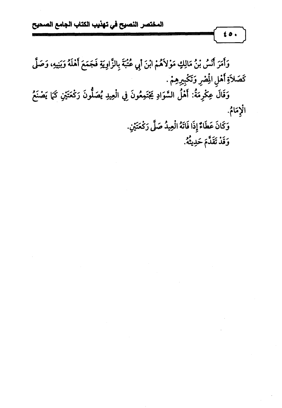 وَأَمَرَ أَنَسُ بْنُ مَالِكٍ مَوْلاَهُمْ ابْنَ أبِي عُتْبَةَ بِالزَّاوِيَةِ فَجَمَعَ أَهْلَهُ وَبَنِيهِ، وَصَلَّى كَصَلاَةِ أَهْلِ الْمِصْرِ وَتَكْبِيرِهِمْ.