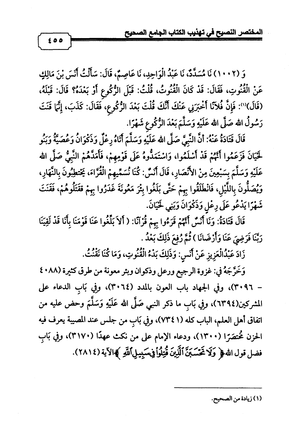 وَخَرَّجَهُ في: غزوة الرجيع ورعل وذكوان وبئر معونة من طرق كثيرة (4088 - 3096) , وفي الجهاد باب العون بالمدد (3064) , وفِي بَابِ الدعاء على المشركين (6394) , وفِي بَابِ ما ذكر النبي صَلَّى الله عَلَيْهِ وَسَلَّمَ وحض عليه من اتفاق أهل العلم, الباب كله (7341) , وفِي بَابِ من جلس عند المصيبة يعرف فيه الحزن مُختصَرًا (1300)، ودعاء الإمام على من نكث عهدًا (3170)، وفِي بَابِ فضل قول الله {وَلَا تَحْسَبَنَّ الَّذِينَ قُتِلُوا فِي سَبِيلِ اللَّهِ} الآية (2814).