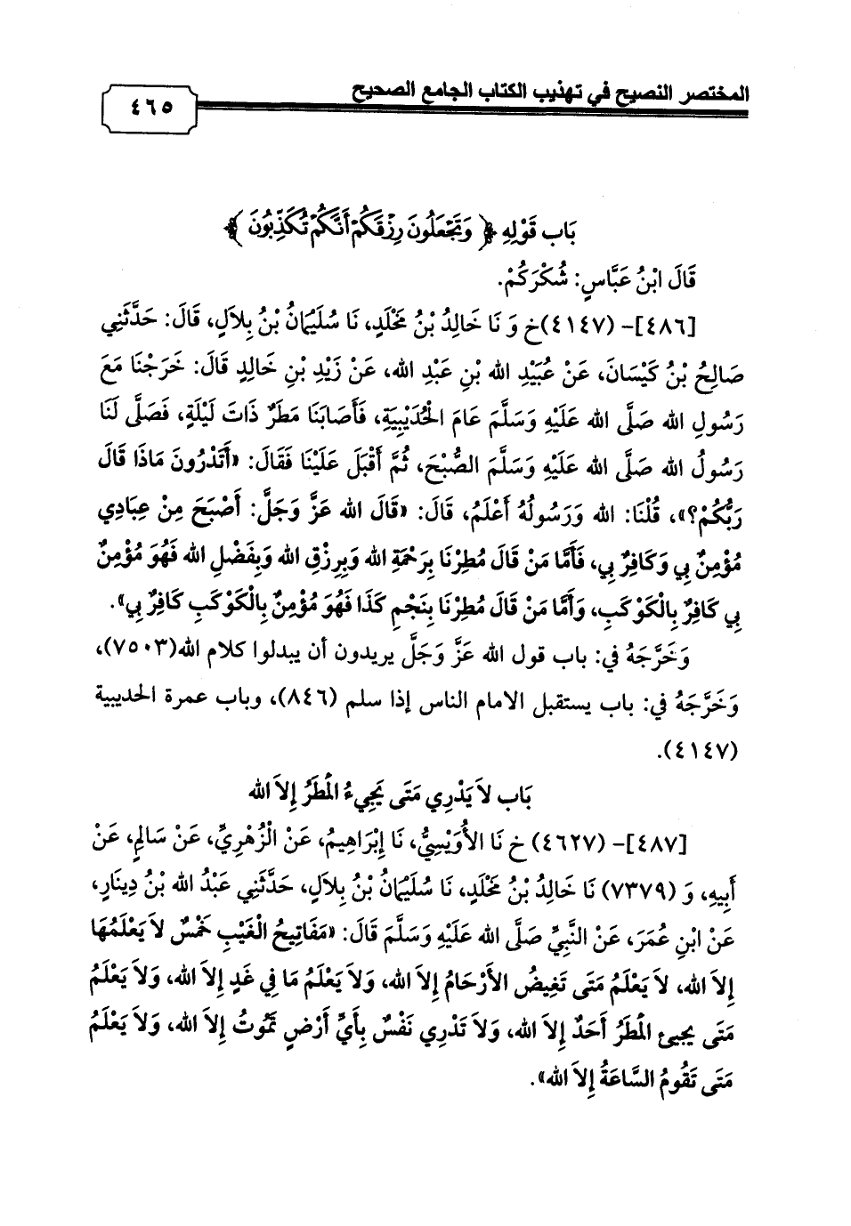 [486]- (4147) خ وَنَا خَالِدُ بْنُ مَخْلَدٍ، نَا سُلَيْمَانُ بْنُ بِلاَلٍ، قَالَ: حَدَّثَنِي صَالِحُ بْنُ كَيْسَانَ، عَنْ عُبَيْدِ الله بْنِ عَبْدِ الله، عَنْ زَيْدِ بْنِ خَالِدٍ قَالَ: خَرَجْنَا مَعَ رَسُولِ الله صَلَّى الله عَلَيْهِ وَسَلَّمَ عَامَ الْحُدَيْبِيَةِ، فَأَصَابَنَا مَطَرٌ ذَاتَ لَيْلَةٍ، فَصَلَّى لَنَا رَسُولُ الله صَلَّى الله عَلَيْهِ وَسَلَّمَ الصُّبْحَ، ثُمَّ أَقْبَلَ عَلَيْنَا فَقَالَ: «أَتَدْرُونَ مَاذَا قَالَ رَبُّكُمْ؟» , قُلْنَا: الله وَرَسُولُهُ أَعْلَمُ, قَالَ: «قَالَ الله عَزَّ وَجَلَّ: أَصْبَحَ مِنْ عِبَادِي مُؤْمِنٌ بِي وَكَافِرٌ بِي، فَأَمَّا مَنْ قَالَ مُطِرْنَا بِرَحْمَةِ الله وَبِرِزْقِ الله وَبِفَضْلِ الله فَهُوَ مُؤْمِنٌ بِي كَافِرٌ بِالْكَوْكَبِ، وَأَمَّا مَنْ قَالَ مُطِرْنَا بِنَجْمِ كَذَا فَهُوَ مُؤْمِنٌ بِالْكَوْكَبِ كَافِرٌ بِي».