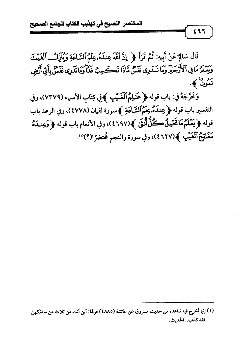 وَخَرَّجَهُ في: باب قوله {عَالِمُ الْغَيْبِ} فِي كِتَابِ الأسماء (7379) , وفي التفسير باب قوله {عِنْدَهُ عِلْمُ السَّاعَةِ} سورة لقمان (4778) , وفي الرعد باب قوله {يَعْلَمُ مَا تَحْمِلُ كُلُّ أُنْثَى} (4697) , وفي الأنعام باب قوله {وَعِنْدَهُ مَفَاتِحُ الْغَيْبِ} (4627) , وفي سورة والنجم مُختصَرًا (؟) (¬1).