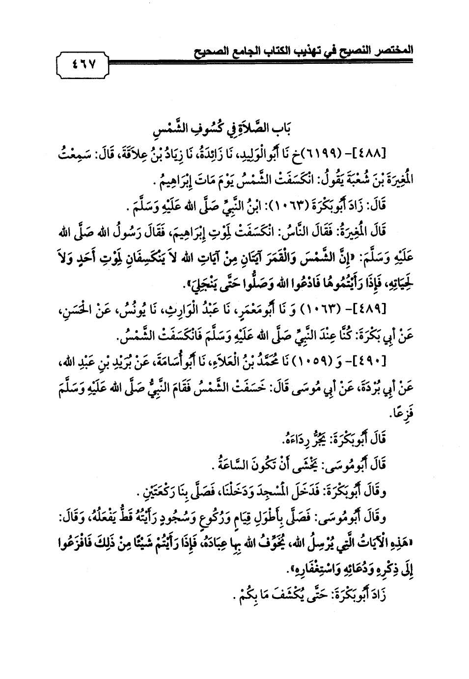 [489]- (1063) وَنَا أَبُومَعْمَرٍ، نَا عَبْدُ الْوَارِثِ، نَا يُونُسُ، عَنْ الْحَسَنِ، عَنْ أبِي بَكْرَةَ: كُنَّا عِنْدَ النَّبِيِّ صَلَّى الله عَلَيْهِ وَسَلَّمَ فَانْكَسَفَتْ الشَّمْسُ.