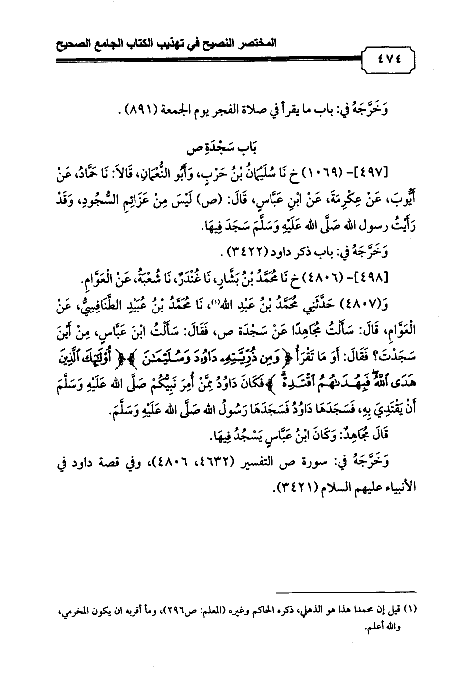 [497]- (1069) خ نَا سُلَيْمَانُ بْنُ حَرْبٍ، وَأَبُو النُّعْمَانِ، قَالاَ: نَا حَمَّادُ، عَنْ أَيُّوبَ، عَنْ عِكْرِمَةَ، عَنْ ابْنِ عَبَّاسٍ، قَالَ: (ص) لَيْسَ مِنْ عَزَائِمِ السُّجُودِ، وَقَدْ رَأَيْتُ رسول الله صَلَّى الله عَلَيْهِ وَسَلَّمَ سَجَدَ فِيهَا.