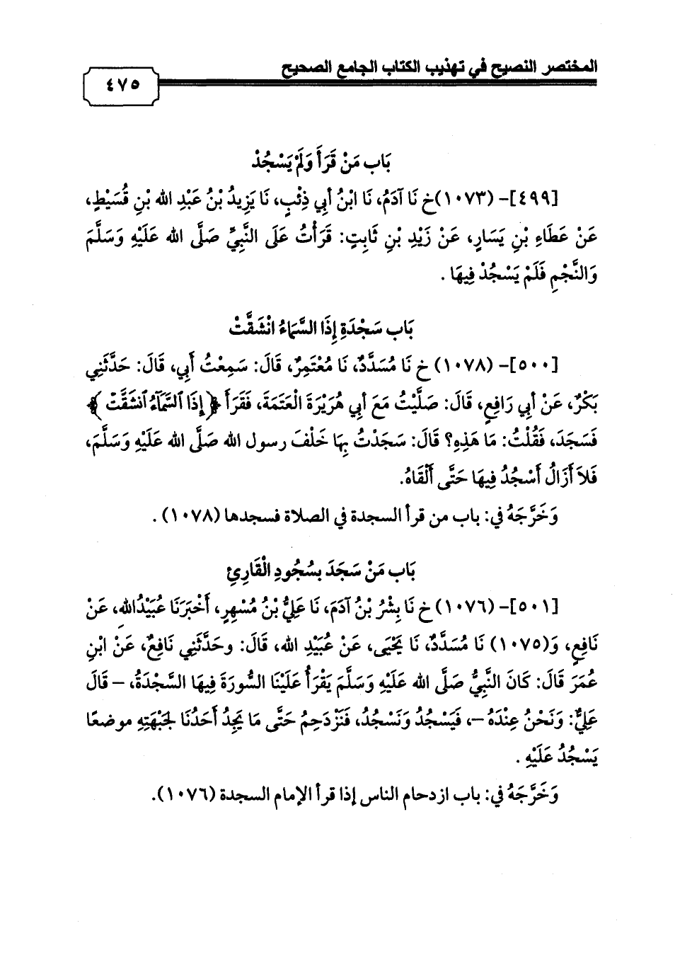 [500]- (1078) خ نَا مُسَدَّدٌ، نَا مُعْتَمِرٌ، قَالَ: سَمِعْتُ أَبِي، قَالَ: حَدَّثَنِي بَكْرٌ، عَنْ أبِي رَافِعٍ، قَالَ: صَلَّيْتُ مَعَ أبِي هُرَيْرَةَ الْعَتَمَةَ، فَقَرَأَ {إِذَا السَّمَاءُ انْشَقَّتْ} فَسَجَدَ، فَقُلْتُ: مَا هَذِهِ؟ قَالَ: سَجَدْتُ بِهَا خَلْفَ رسول الله صَلَّى الله عَلَيْهِ وَسَلَّمَ، فَلاَ أَزَالُ أَسْجُدُ فِيهَا حَتَّى أَلْقَاهُ.
