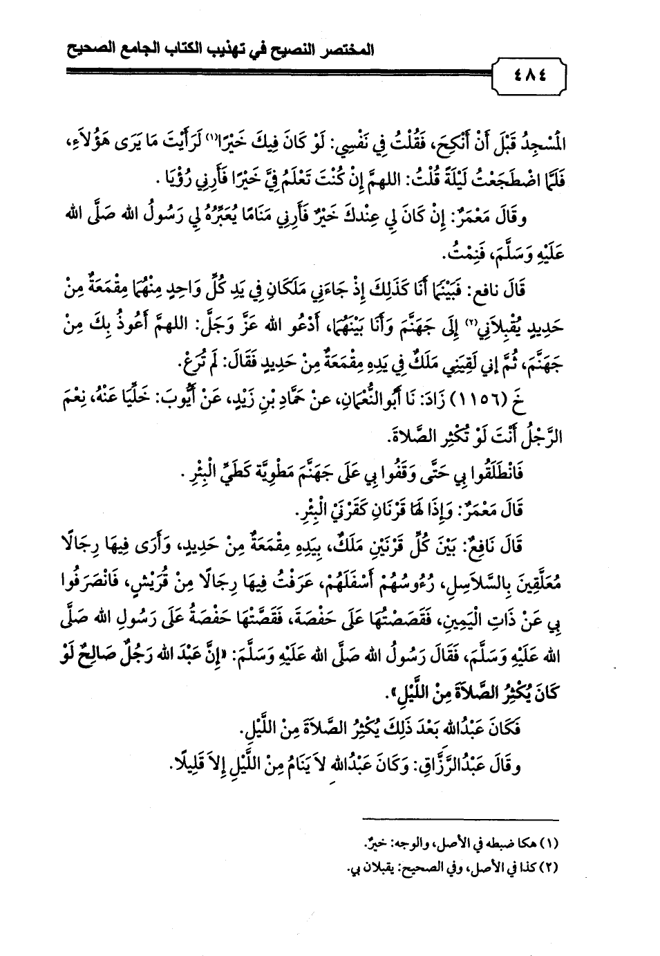 قَالَ نَافِعٌ: بَيْنَ كُلِّ قَرْنَيْنِ مَلَكٌ، بِيَدِهِ مِقْمَعَةٌ مِنْ حَدِيدٍ، وَأَرَى فِيهَا رِجَالًا مُعَلَّقِينَ بِالسَّلاَسِلِ، رُءُوسُهُمْ أَسْفَلَهُمْ، عَرَفْتُ فِيهَا رِجَالًا مِنْ قُرَيْشٍ، فَانْصَرَفُوا بِي عَنْ ذَاتِ الْيَمِينِ، فَقَصَصْتُهَا عَلَى حَفْصَةَ، فَقَصَّتْهَا حَفْصَةُ عَلَى رَسُولِ الله صَلَّى الله عَلَيْهِ وَسَلَّمَ, فَقَالَ رَسُولُ الله صَلَّى الله عَلَيْهِ وَسَلَّمَ: «إِنَّ عَبْدَ الله رَجُلٌ صَالِحٌ لَوْ كَانَ يُكْثِرُ الصَّلاَةَ مِنْ اللَّيْلِ».