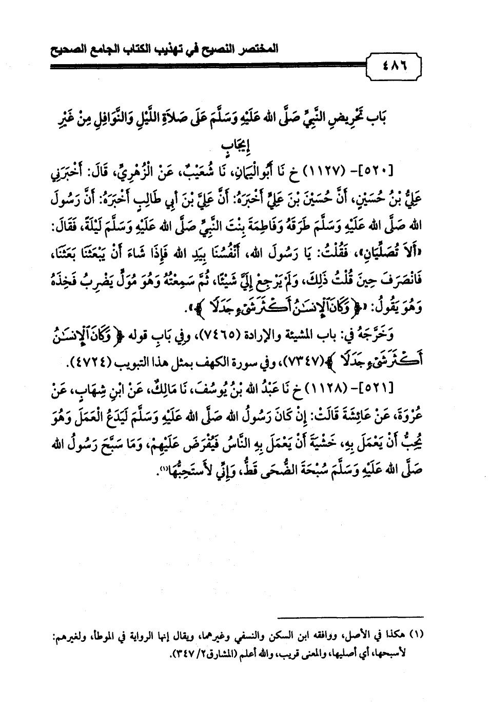 [520]- (1127) خ نَا أَبُوالْيَمَانِ، نَا شُعَيْبٌ، عَنْ الْزُهْرِيِّ، قَالَ: أَخْبَرَنِي عَلِيُّ بْنُ حُسَيْنٍ، أَنَّ حُسَيْنَ بْنَ عَلِيٍّ أَخْبَرَهُ: أَنَّ عَلِيَّ بْنَ أبِي طَالِبٍ أَخْبَرَهُ: أَنَّ رَسُولَ الله صَلَّى الله عَلَيْهِ وَسَلَّمَ طَرَقَهُ وَفَاطِمَةَ بِنْتَ النَّبِيِّ صَلَّى الله عَلَيْهِ وَسَلَّمَ لَيْلَةً، فَقَالَ: «أَلاَ تُصَلِّيَانِ» , فَقُلْتُ: يَا رَسُولَ الله، أَنْفُسُنَا بِيَدِ الله فَإِذَا شَاءَ أَنْ يَبْعَثَنَا بَعَثَنَا، فَانْصَرَفَ حِينَ قُلْتُ ذَلِكَ، وَلَمْ يَرْجِعْ إِلَيَّ شَيْئًا، ثُمَّ سَمِعْتُهُ وَهُوَ مُوَلٍّ يَضْرِبُ فَخِذَهُ وَهُوَ يَقُولُ: «{وَكَانَ الْإِنْسَانُ أَكْثَرَ شَيْءٍ جَدَلًا}».
