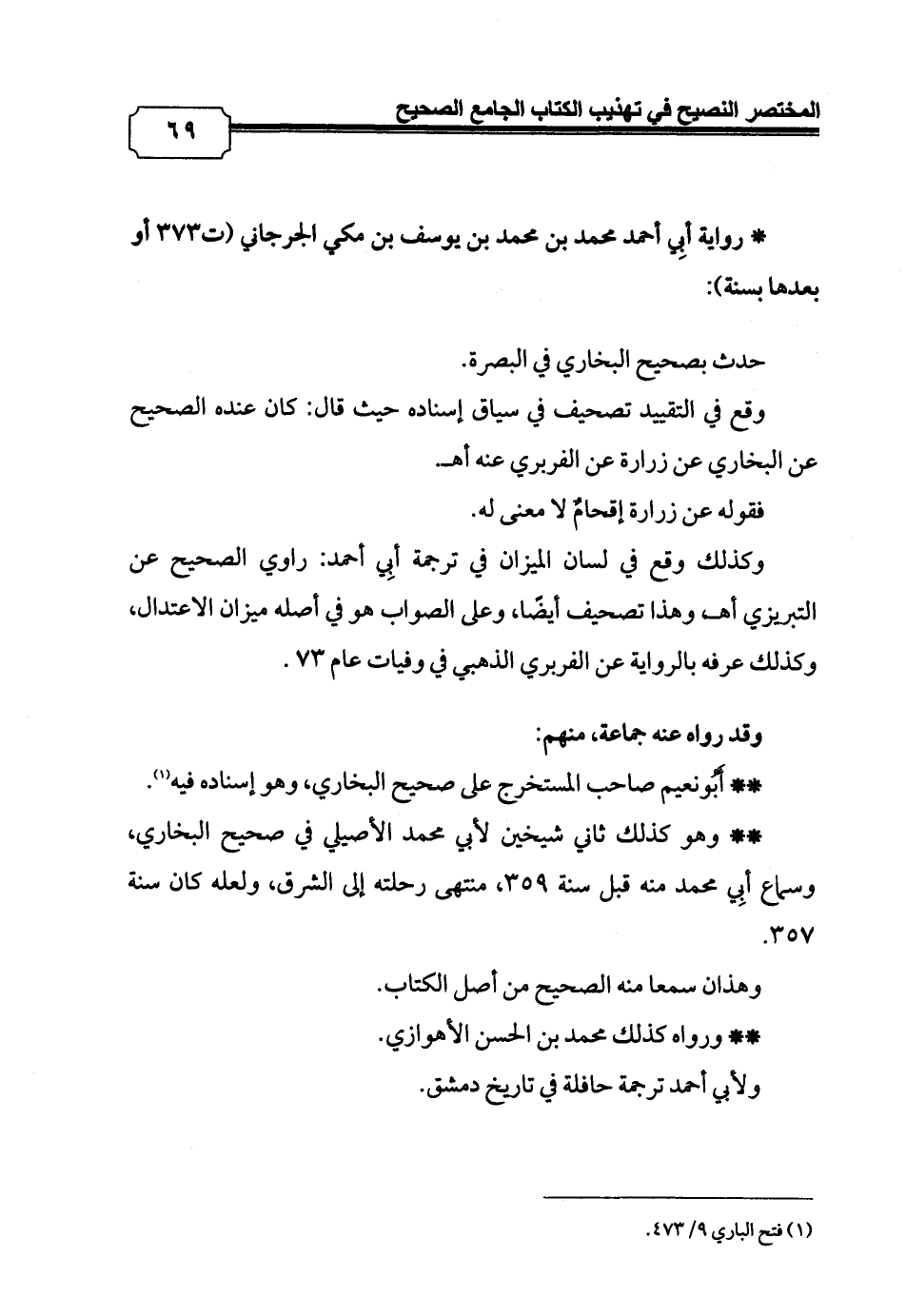 وكذلك وقع في لسان الميزان في ترجمة أبِي أحمد: راوي الصحيح عن التبريزي أهـ، وهذا تصحيف أيضًا، وعلى الصواب هو في أصله ميزان الاعتدال، وكذلك عرفه بالرواية عن الفربري الذهبي في وفيات عام 73.