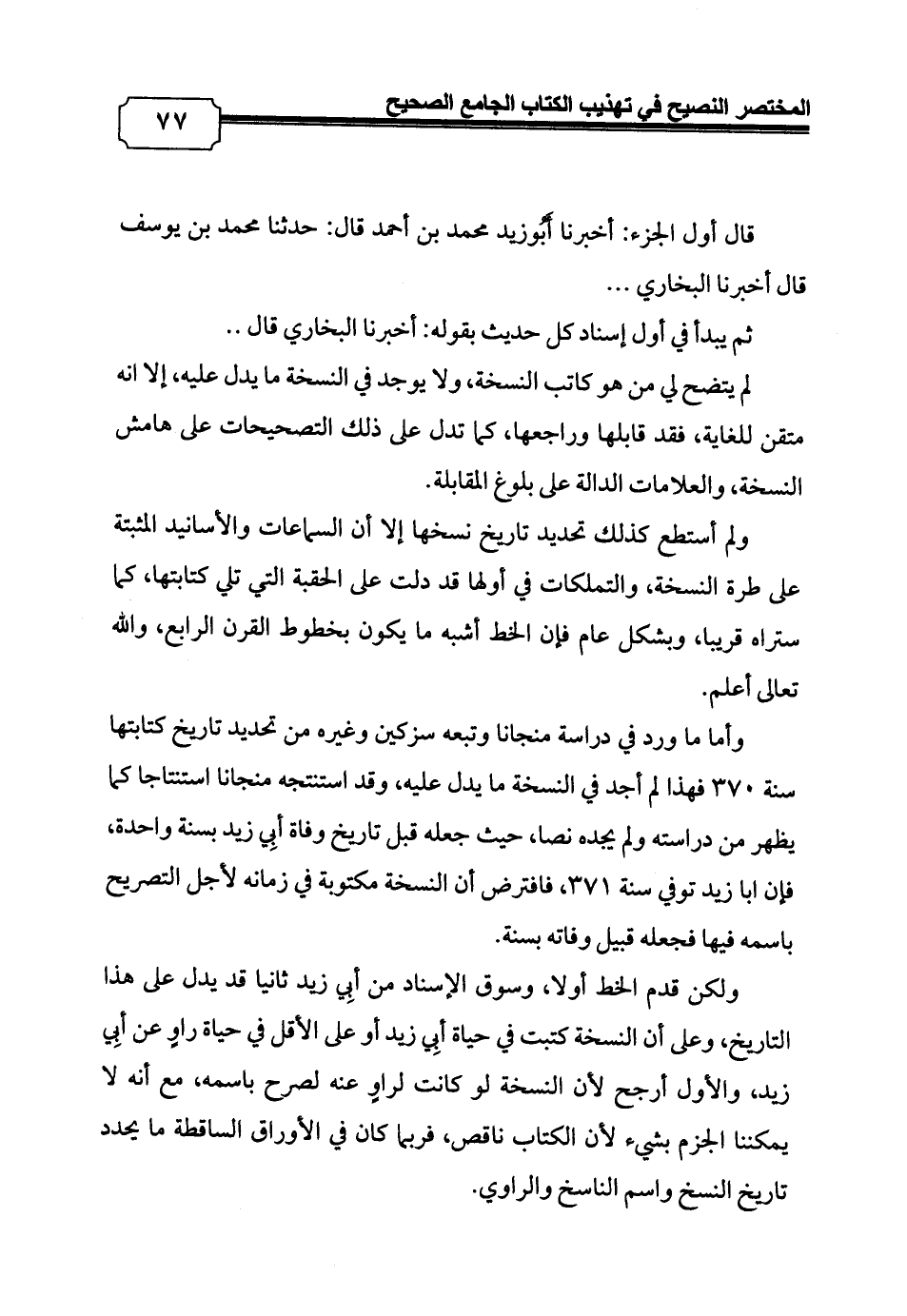 ولكن قدم الخط أولا، وسوق الإسناد من أبِي زيد ثانيا قد يدل على هذا التاريخ, وعلى أن النسخة كتبت في حياة أبِي زيد أو على الأقل في حياة راوٍ عن أبِي زيد، والأول أرجح لأن النسخة لو كانت لراوٍ عنه لصرح باسمه، مع أنه لا يمكننا الجزم بشيء لأن الكتاب ناقص, فربما كان في الأوراق الساقطة ما يحدد تاريخ النسخ واسم الناسخ والراوي.