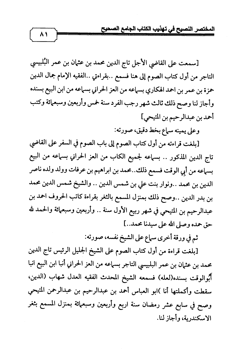 [سمعت على القاضي الأجل تاج الدين محمد بن عثمان بن عمر البُلبيسي التاجر من أول كتاب الصوم إلى هنا فسمع .. بقراءتي .. الفقيه الإمام جمال الدين حمزة بن عمر بن احمد الهكاري بسماعه من العز الحراني بسماعه من ابن البيع بسنده وأجاز لنا وصح ذلك ثالث شهر رجب الفرد سنة خمس وأربعين وسبعمائة وكتب أحمد بن عبد الرحيم بن المتيحي]